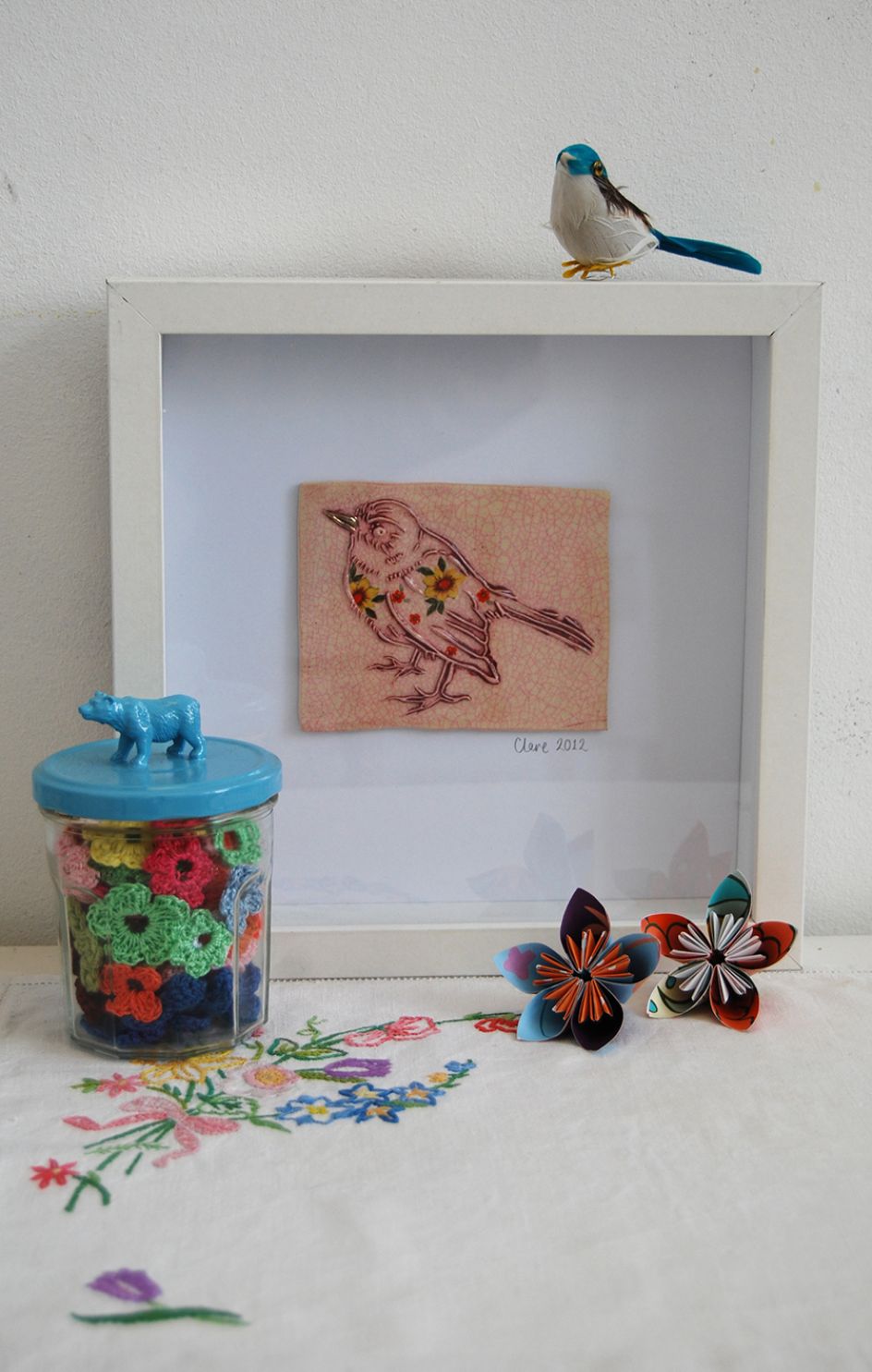 In Clare's own words: "The idea of having the space was to give me somewhere to focus on my own work (after designing/making pretty much everything for my wedding last August) and to stop leaving my art stuff all over the house... although I just seem to be leaving creative mess at both my house and studio now! Ideally, I aim to use the studio two days a week and one evening. I’d really like to spend more time there but there aren’t enough hours in the week and my family would like to see me occasionally too! My own artwork is quite mixed and I work with ceramics, textiles and digital media.