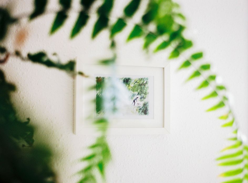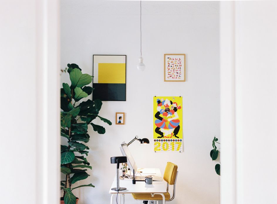 My plants, my book collection, the postcard I own by Eckersley, and all the prints from my friends: Till Hafenbrak, Golden Cosmos, Nicolas Burrows and Laura Junger Having their work around me feels like they are working with me every day, and I like that a lot.