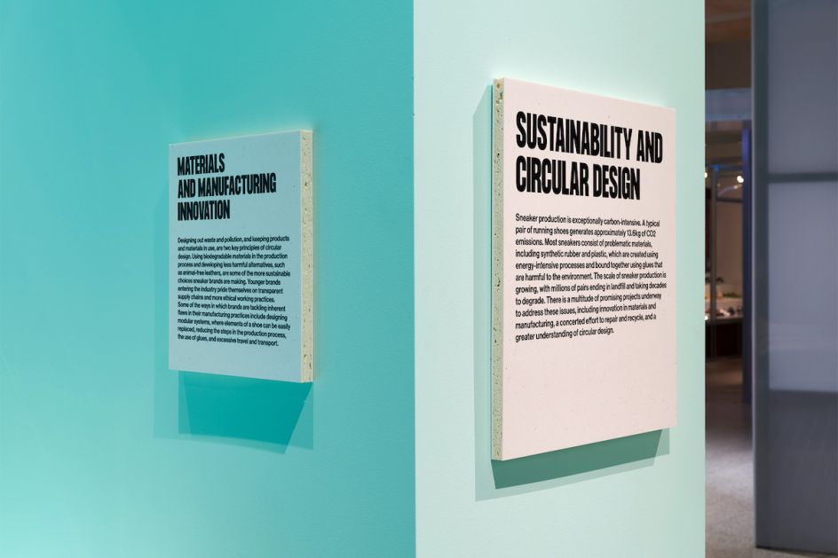 Throughout the exhibition, infographics are used to convey information around sneakers' construction, design and production of sneakers. The colours on the infographics were chosen to work with the surrounding installation elements and are displayed on suspended lightbox panels.