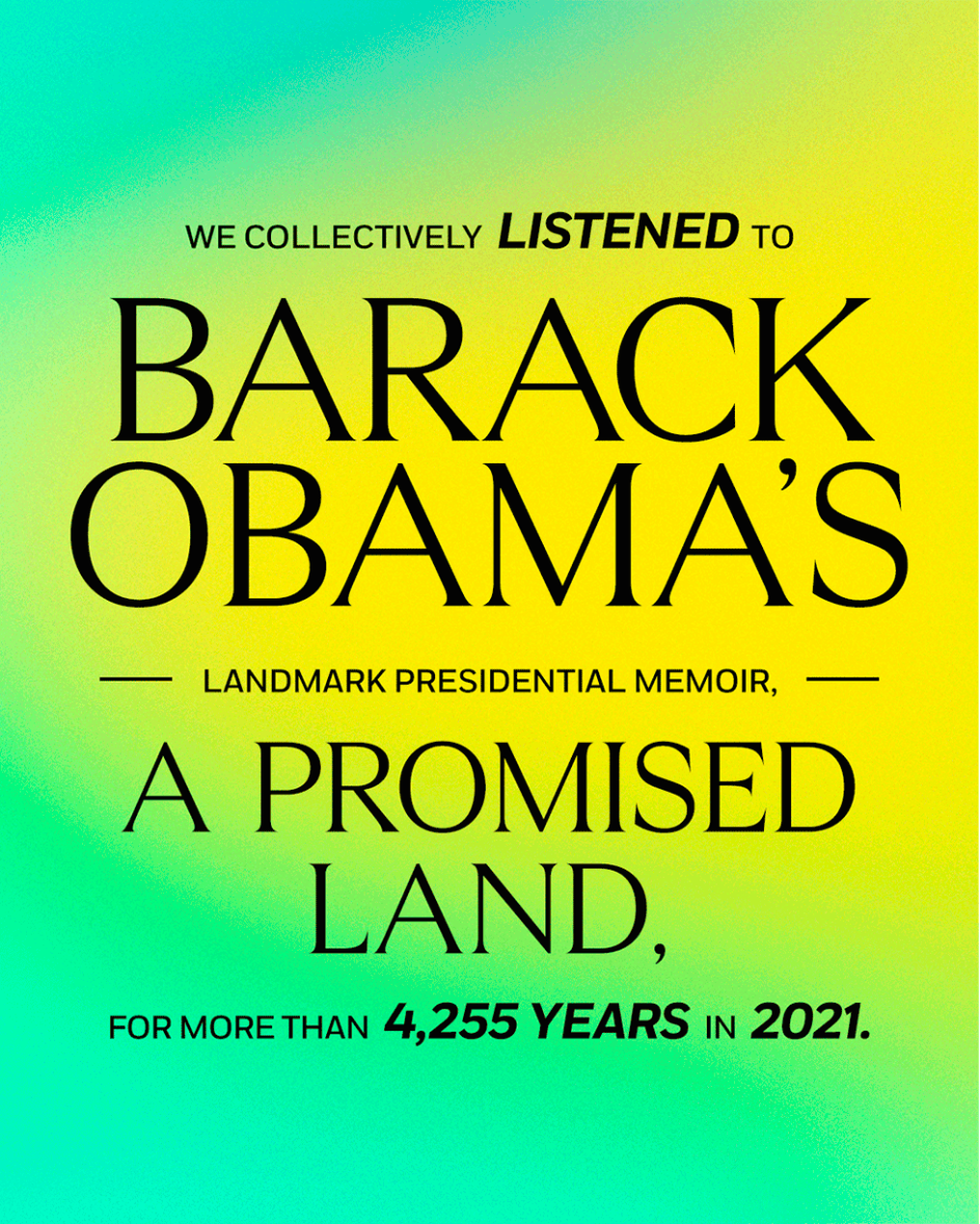 Just Mercy by Bryan Stevenson and Born A Crime by The Daily Show host Trevor Noah were mainstays on the New York Times bestseller list. At the same time, Penguin Random House calculates that Barack Obama's author-narrated audiobook A Promised Land was listened to for more than 4,255 years in 2021.