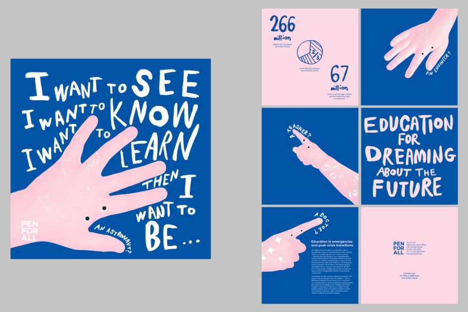 Considering a non-profit organisation for education, Aya Kudo set herself the challenge of designing a mini booklet and advertising materials to reach out and get more attention from potential supporters. Pen For All has a tone of voice, images and hand-drawn texts to express children's energy and their potential towards the future. Designed to make people feel connected and encourage them to get involved.