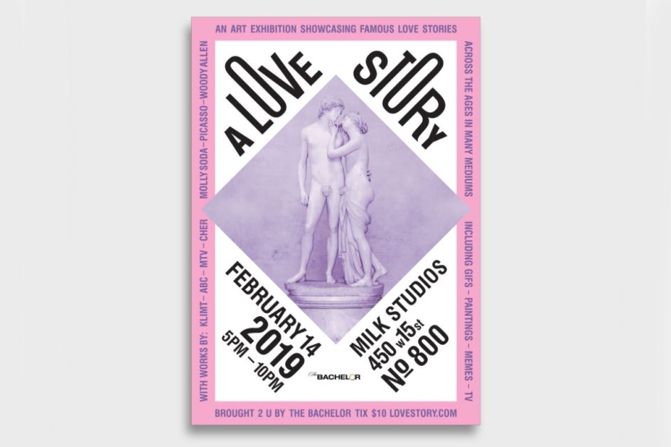 A Love Story is an art exhibition dreamt up by Kathy Geisel at our New York campus. Showcasing love stories throughout the ages, Kathy used a romantic colour palette, classic sculpture imagery and appealing typography to help change the public's view about the event's sponsors, ABC's reality TV show, The Bachelor.