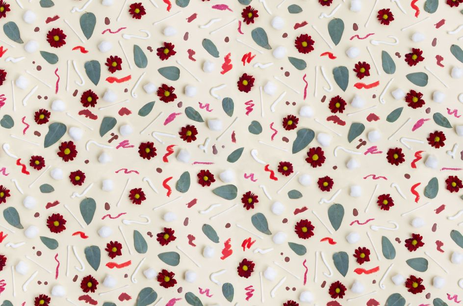 For an alternative version of French Complexion by Christine Clais, Aimee Harel photographed lots of cotton buds, cotton wool, flower petals and creams to create a pretty, repetitive background. We love the little squiggles of lipstick too.