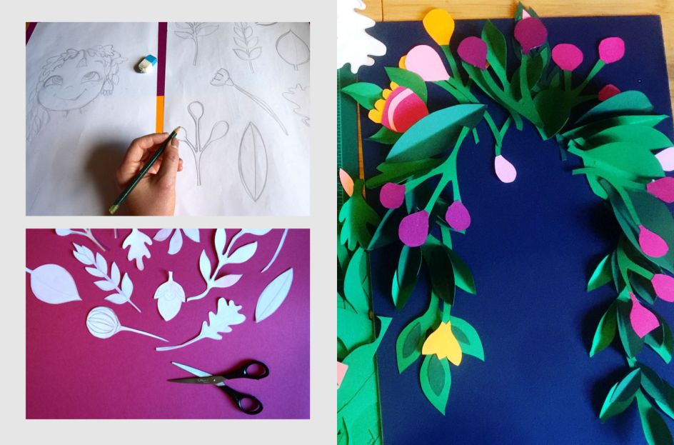For her book cover, Sydney's Sam Alexander was inspired by Sidewalk Flowers, a wordless picture book by Jonarno Lawson that features a little girl who collects wildflowers while her distracted father pays her little attention. Using multiple layers of card, cut into flowers, petals and leaves, Sam's design is rich, colourful and inviting.