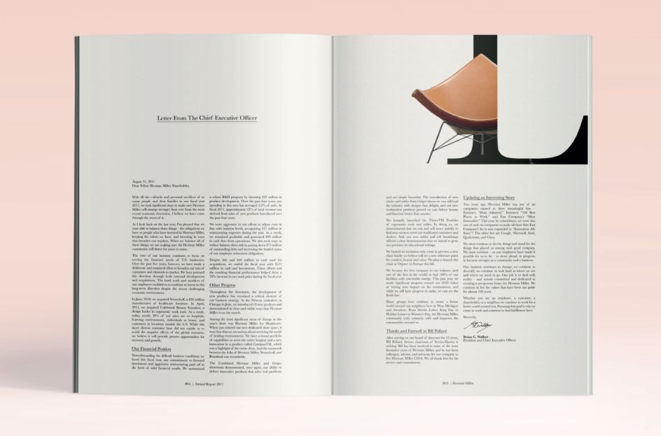Minka Smith's take on Herman Miller's Annual Report was inspired by Swiss modernism. "I kept the typesetting design simple and bold, then I used a bright yet soft pink as the feature colour," she explains.