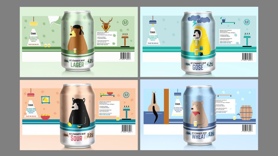 This fun and pretend brand of beer celebrates the brewing scene in New Zealand with a perfectly judged slice of self-deprecation. "It's inspired by our struggle with the pronunciation of 'beer', often confused with our grizzly mates," explains Melbourne student Emma Askin. "I wanted to create a series of cans that are playful and celebrate the charm of New Zealand humour."