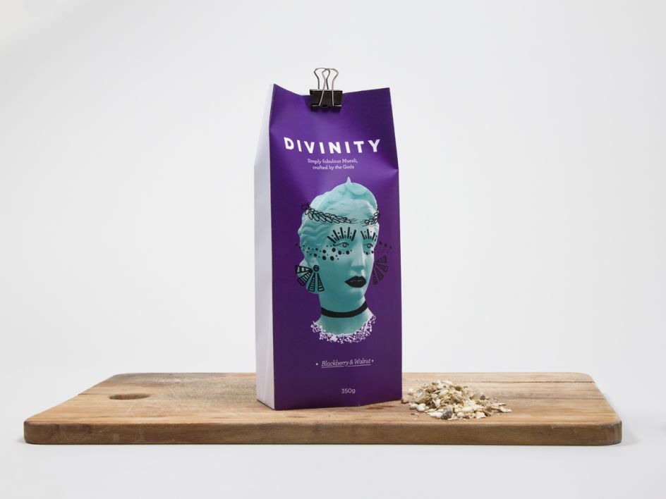 We love Jenny Crawford's response to the brief: "Create authentic muesli packaging that would appeal to a nail technician". Her neon-coloured quirky illustrations were combined with images of Greek goddesses to create a fun, boutique look that was then rolled out into different flavours.