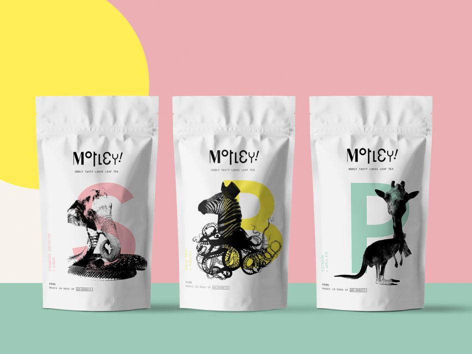 This fun and vibrant packaging by Jade Peyton is for an "oddly tasty loose leaf tea" brand. The Manchester designer added illustrations of animal hybrids for the different flavours, such as a giraffe/kangeroo for her pistachio and apple pie tea. We wish this tea was real!