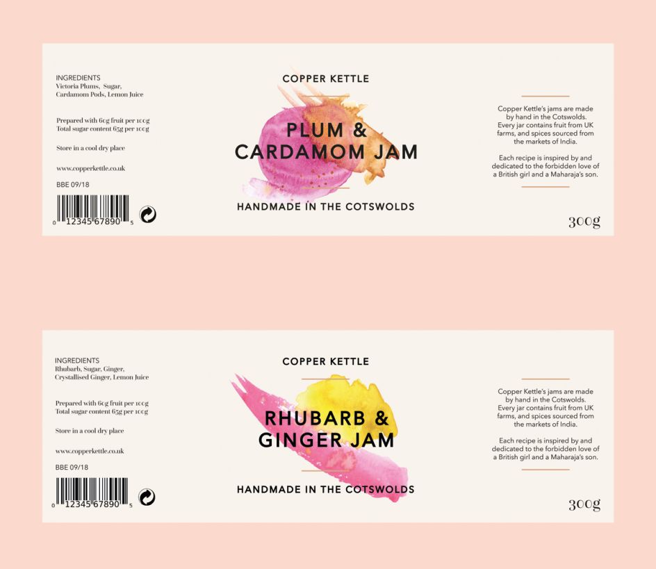 Manchester designer Nicki O'Donoghue dished out a tasty packaging design for Copper Kettle, a boutique jam that she dreamed up. The labels include a series of watercolours, each unique and representing the flavour of the conserve. This look and feel was then rolled out to cookbooks, stationery and even a website.