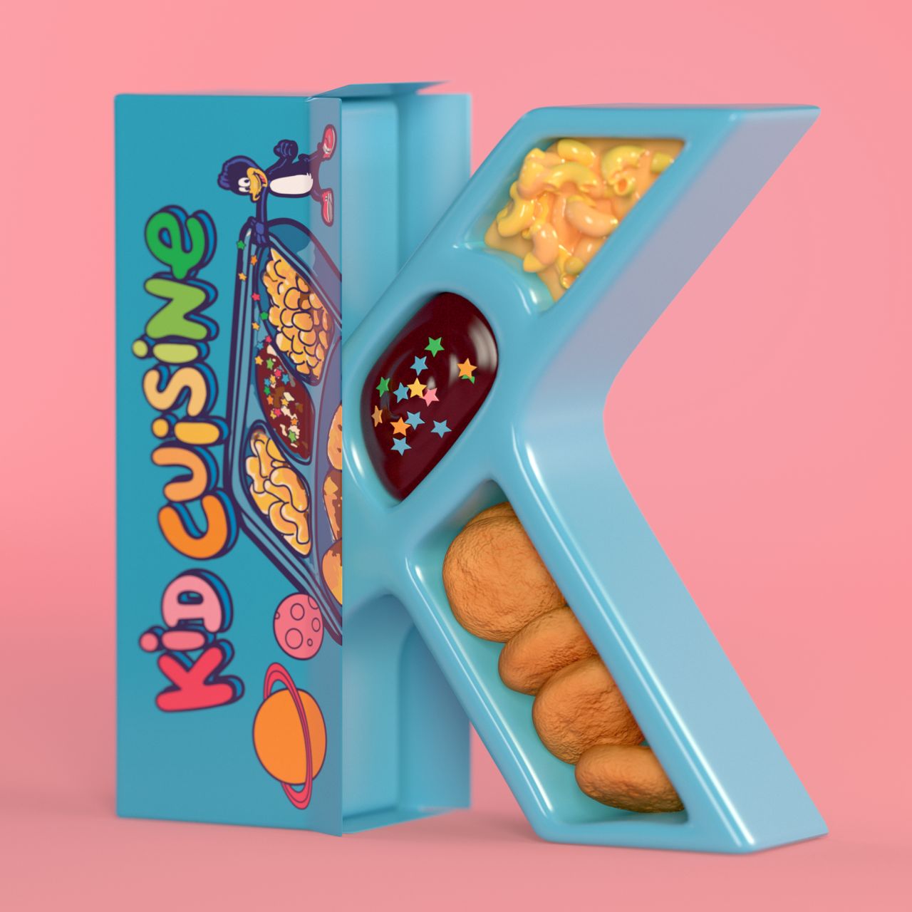 There's also Kid Cuisine for the letter 'K', a popular brand that claimed to be the first microwave meal for children. "I think Kid Cuisine was too expensive to have in my house as a kid. Judging how much I love convenience, I would have liked to be able to pop a meal into the microwave now and then," Camps says. "But who knows how great I would have felt after. Still, the invention of microwave meals for kids was pretty groundbreaking at the time."