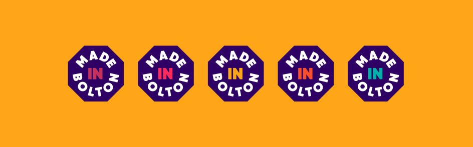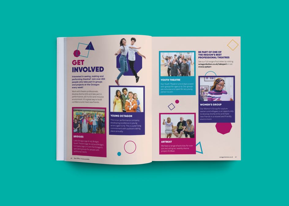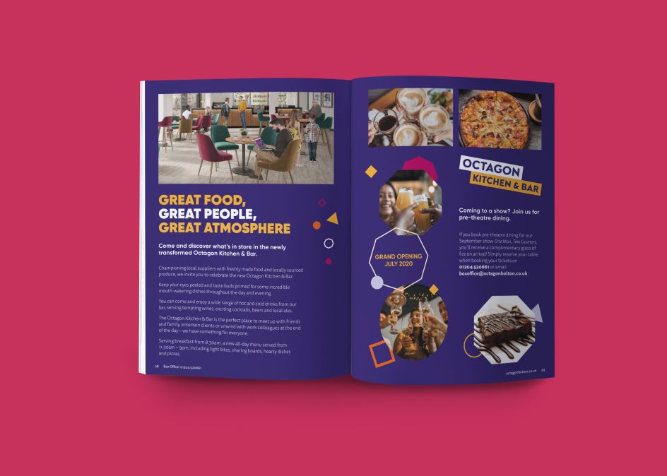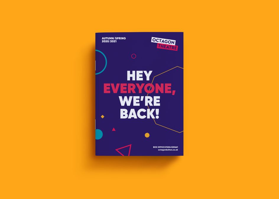 The logo tilts at exactly eight degrees as a subtle nod to the distinctive eight-sided shape of the theatre. The energy of the theatre is embodied through the vibrant colour palette. The messaging, such as 'Everyone's story matters, seriously entertaining theatre and made in Bolton', nods to the Octagon's unpretentious, bold and inclusive personality.