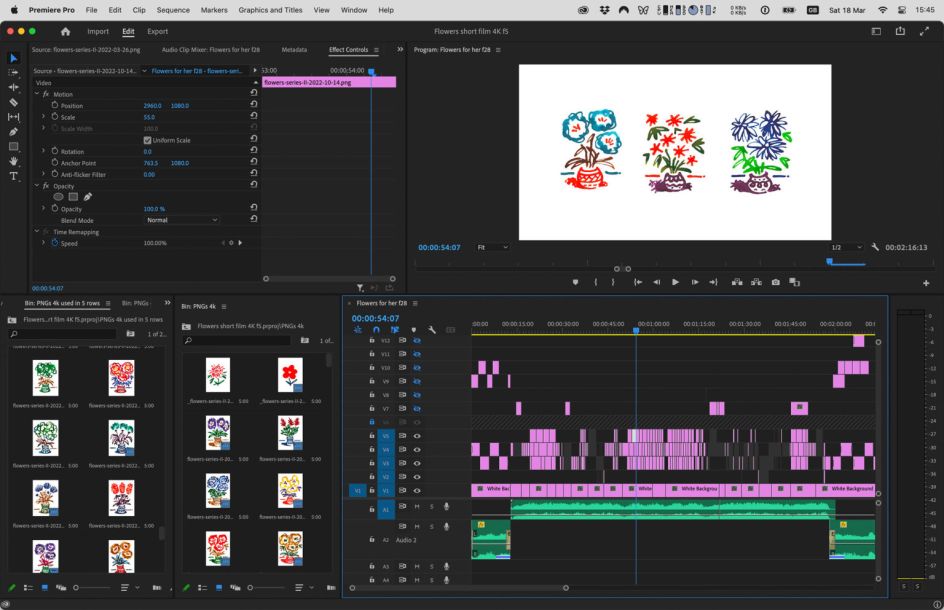 If you discount the time it took to create the daily drawings themselves, A Flower a Day took a couple of weeks to create. This process involved scanning in and retouching the flowers, drawing the lettering for the titles and end captions, and spending a week and a half nailing down the storyboard in Adobe InDesign. The whole project was then edited in Adobe Premiere.