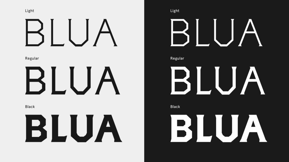 "Finally, we traced the areas of conversion and built a typographic structure with one letter. Based on this structure we designed the entire typeface, which has more than 200 fonts. These fonts not only contain the essence of classic films in the history of cinema, but they are now also part of BLUA's story."