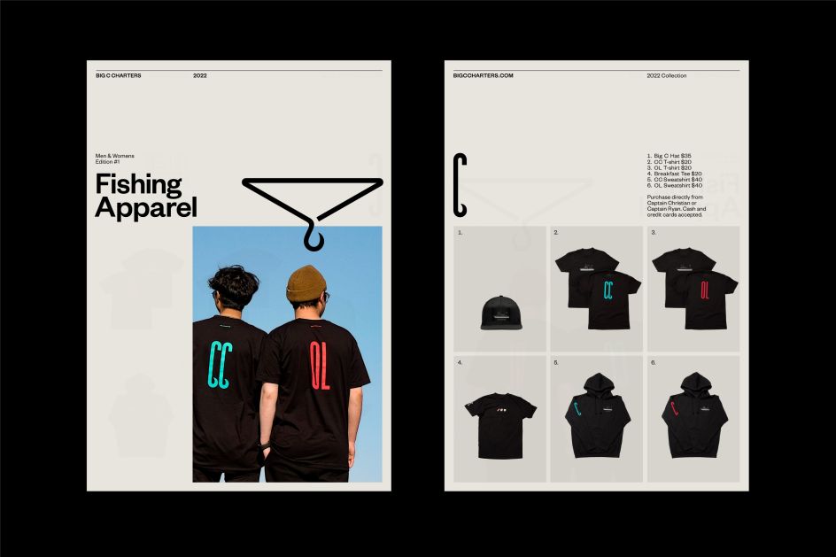 The name Big C Charters itself was an opportunity to create an iconic logo – not just because of its tall founder but also of the fishing theme of the business. In this case, an unforgettably tall, hooked 'C' – pointing to both. Alongside this symbol, a bespoke display typeface aptly named Big C Sans was developed. Inspired by the vernacular of charters, the custom typeface features elongated letterforms with a characteristic fishing hook or wave-like terminals that bring together early san-serif lettering with a contemporary typeface.