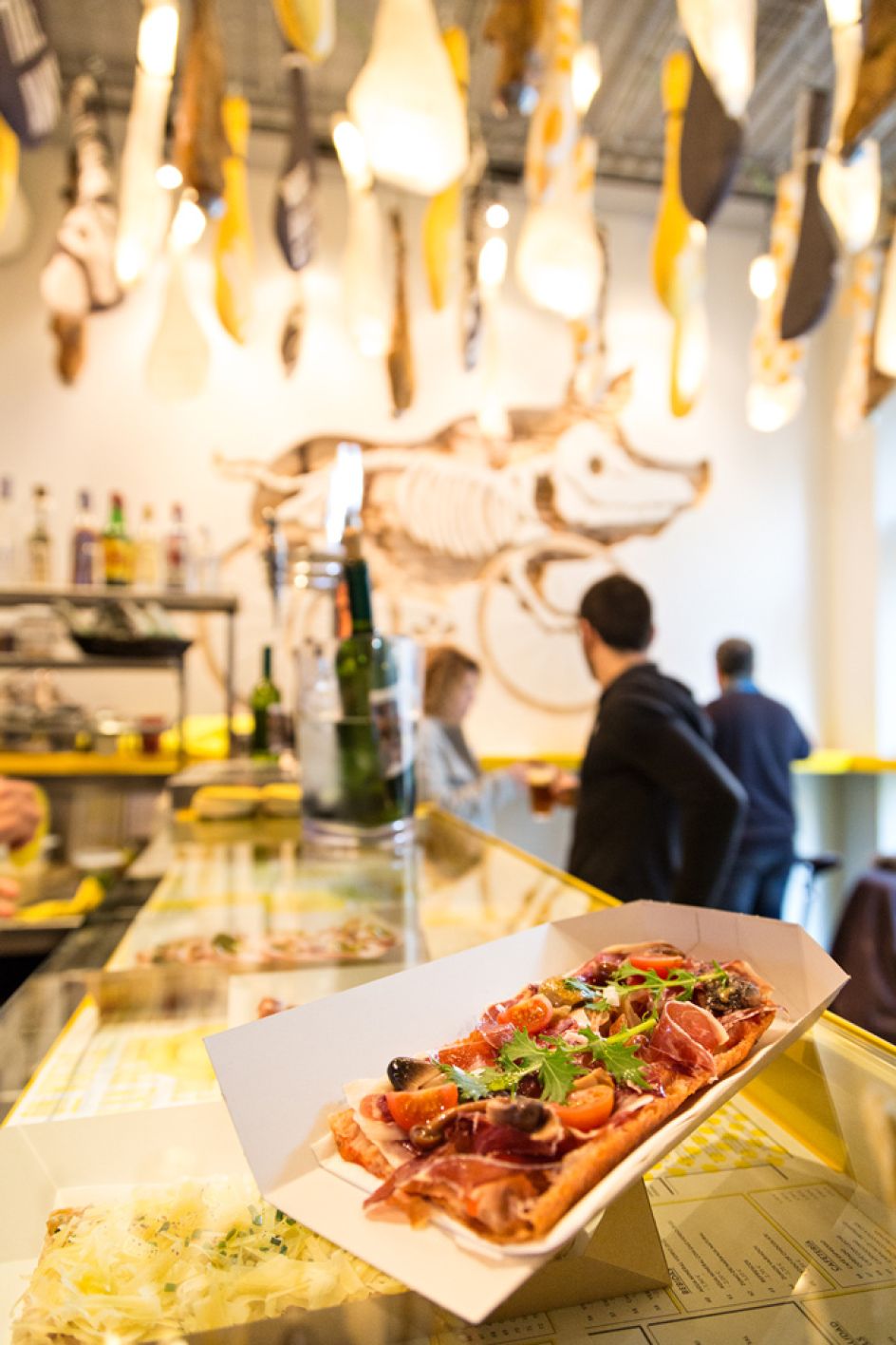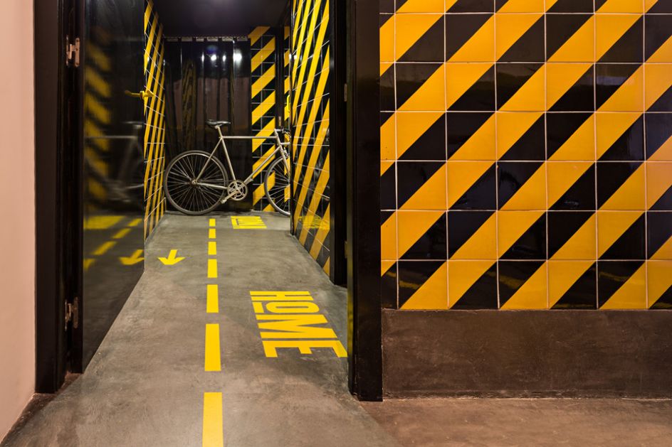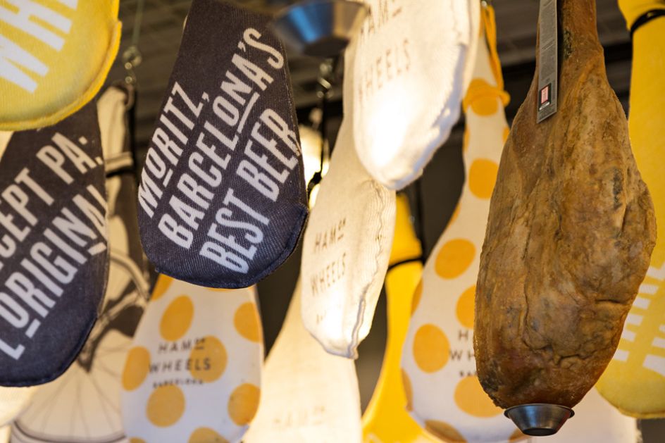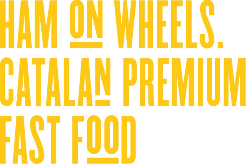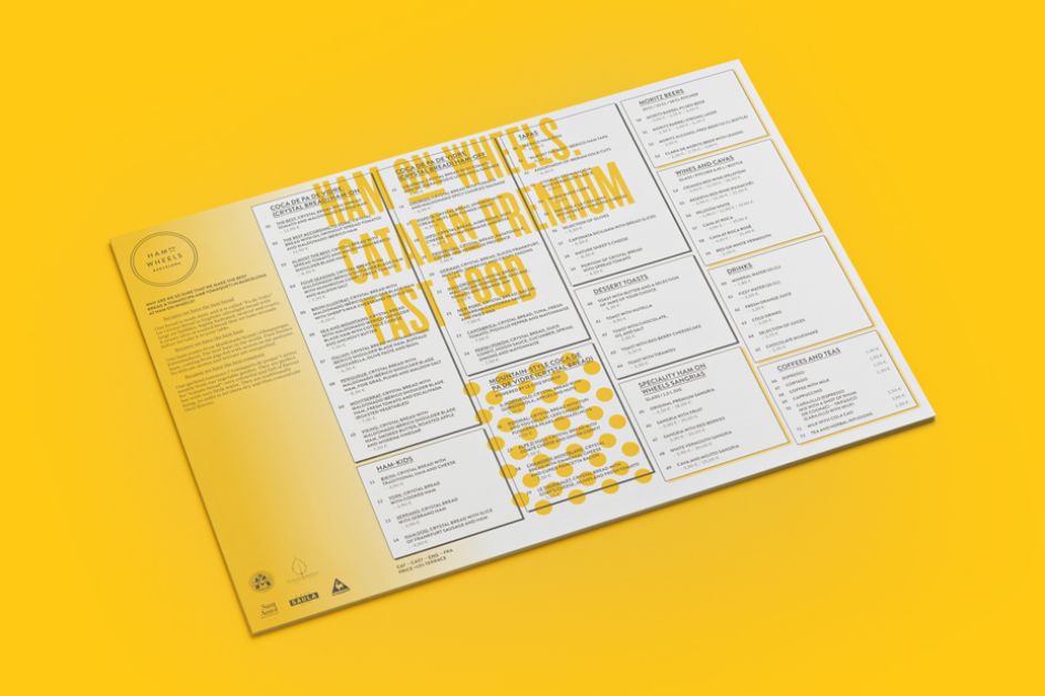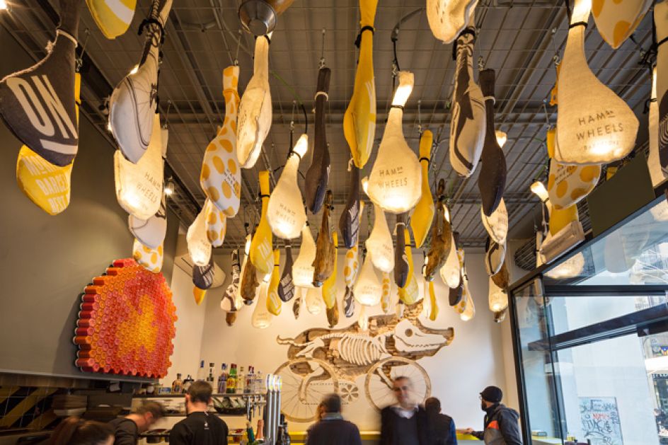 Aptly named Ham on Wheels, Forma & Co has created the logo and accompanying typeface, choosing a bright yellow colour palette that's used throughout the entire branding, including signage, coasters and menus. The studio has even designed graphical elements for the interior of the restaurant, led by designer Chu Uroz, such as decorative hams shaped as bicycle seats, hanging from the ceiling and road markings that are dotted across the flooring.