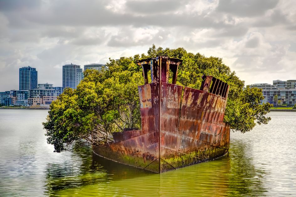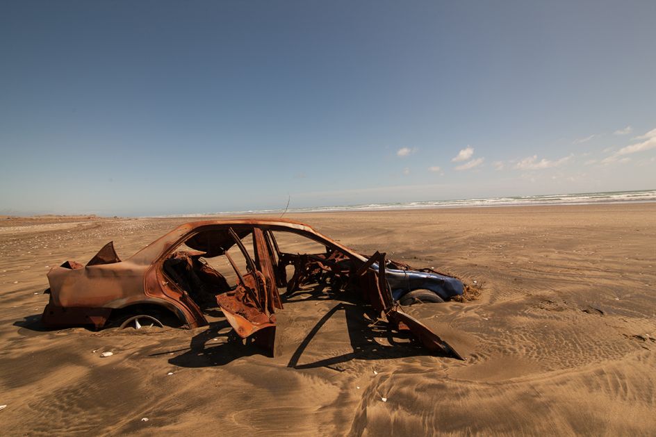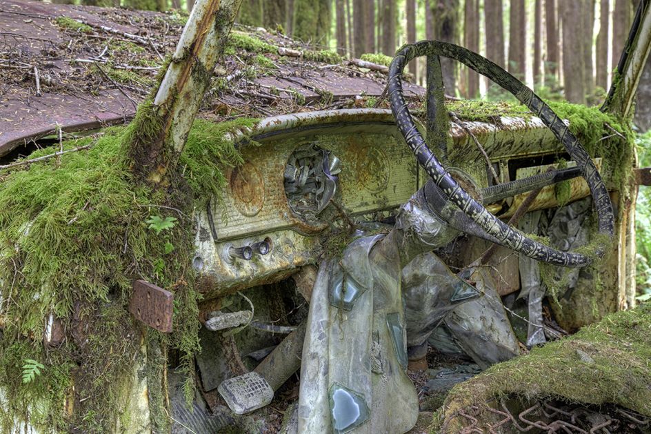 Aside from the peculiar beauty of rusting hulks on forgotten battlefields, anemone-covered battleships on the seabed and cars being consumed by forests, these images introduce us to unusual stories: how a car standing on its nose in the Nevada desert has inspired an artist into making a design feature from junked cars, a Canadian schooner that sank in 1885 and rests preserved to this day in a harbor in Lake Huron, and a space shuttle left gathering dust in a hangar.
