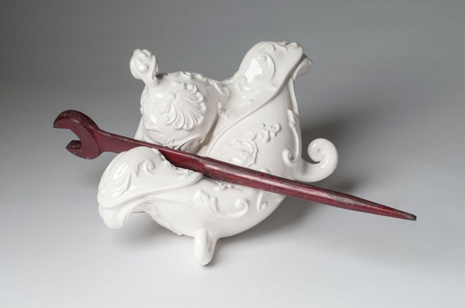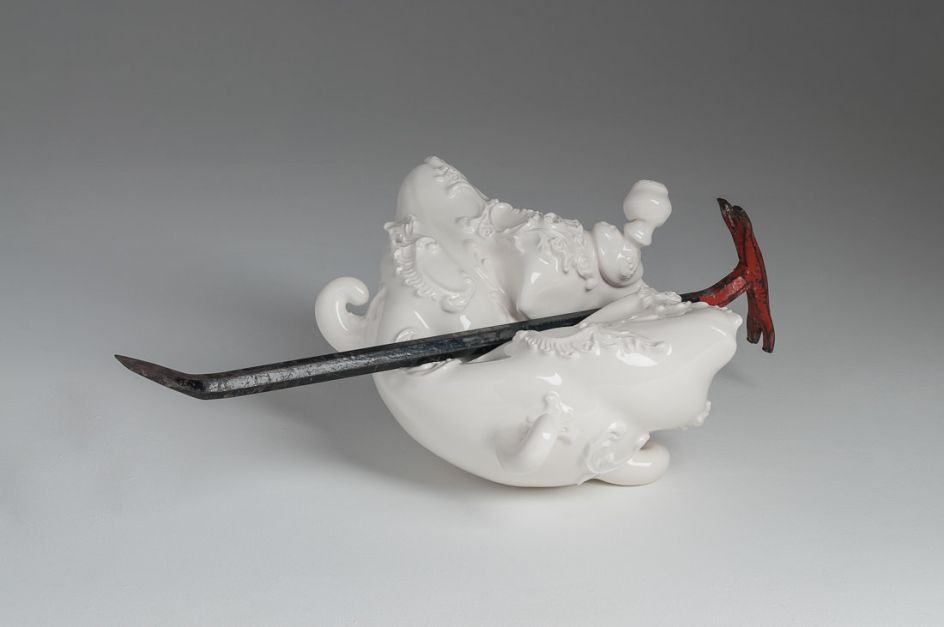 Entitled Abuse, the range of vases, jars and plates are classical in their inspiration but with a twist – each piece seems to meet a torturous end. With axes, baseball bats, driven nails and heavy-booted feet destroying each form, the Montreal-based artist takes porcelain sculpture to a whole new level.