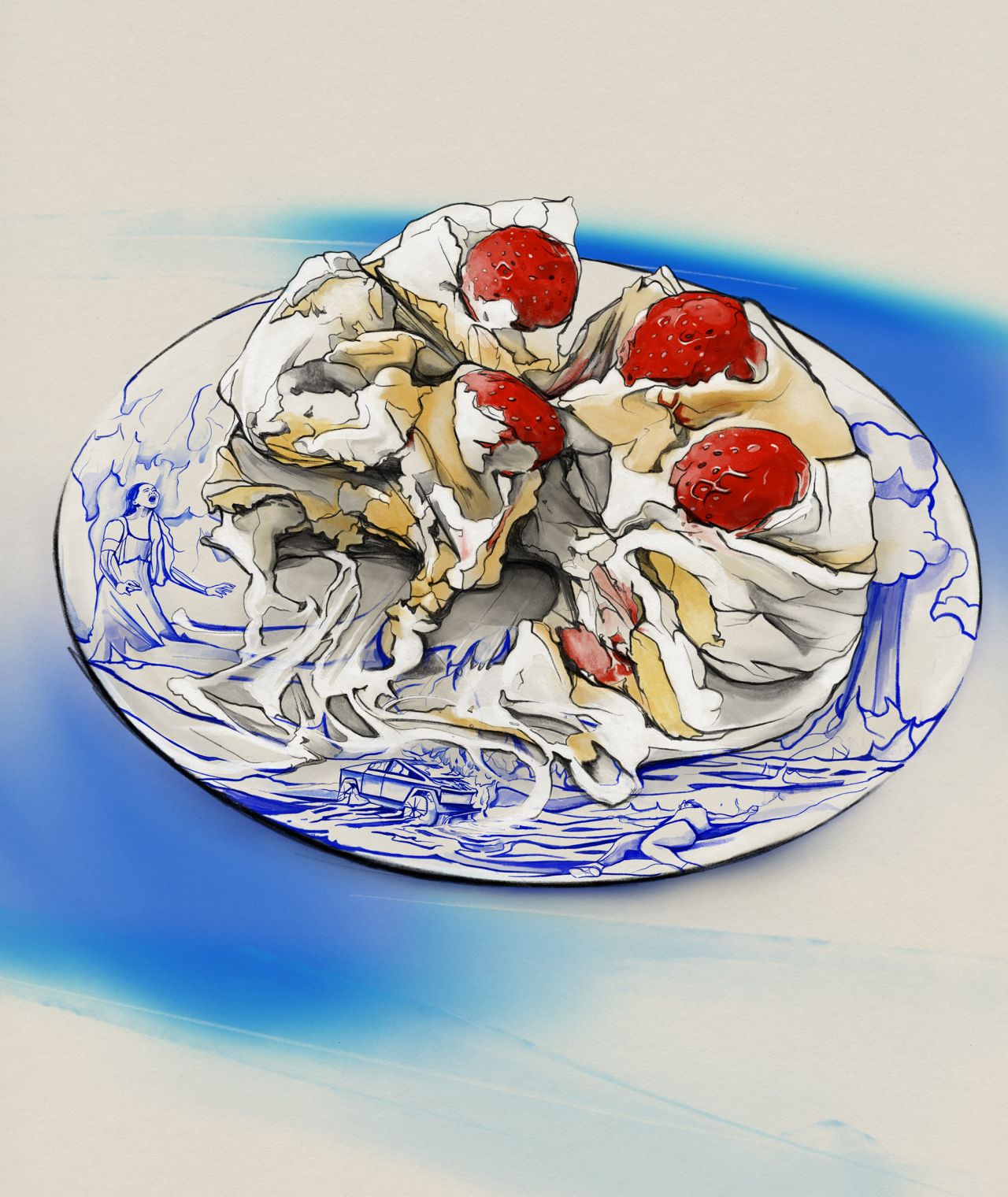 "I kept seeing food photography appearing alongside all the sports imagery. I'd always admired porcelain artwork, and at some point, the two things connected; the idea of placing a narrative inside illustrated desserts arrived rather than being planned," says Alexis.