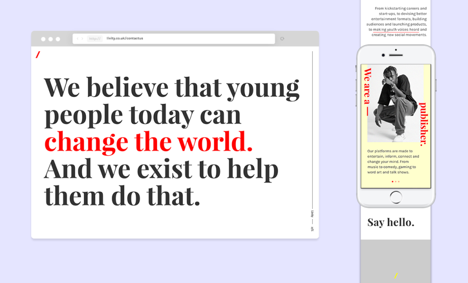 The agency’s rebrand is a reflection of this busyness and energy, launched to coincide with its sweet 16th birthday and repositioning as a youth-led creative network. The new designs were created by Livity creative director James Hogwood, designer Sian Spicer and creative lead Vinny K-Maddage, and are inspired by editorial platforms. "It’s quite a noisy new look but it definitely has a point of view," says Hogwood. "Young people are defiant, noisy, hopeful, and positive by nature. We wanted to embody some of that creative energy and ever-changing style."