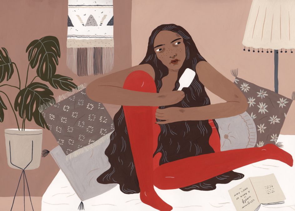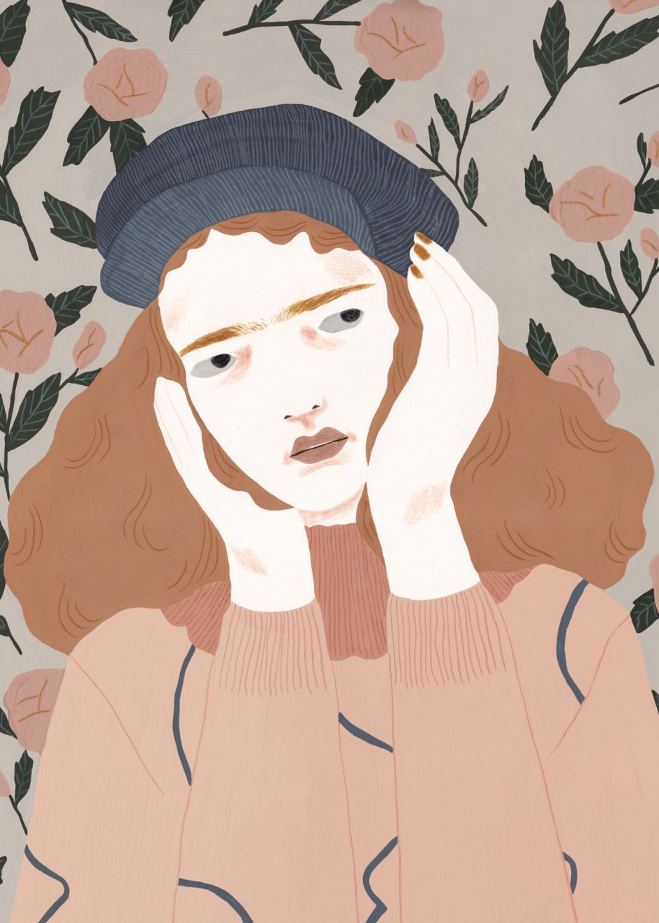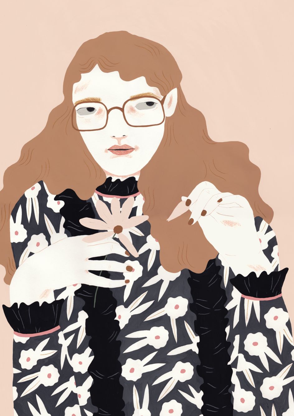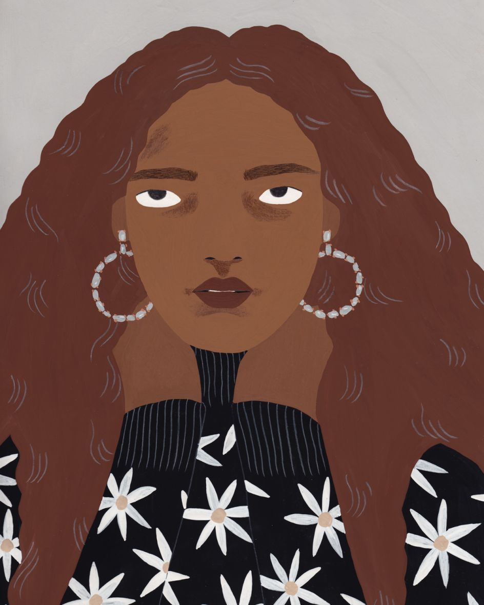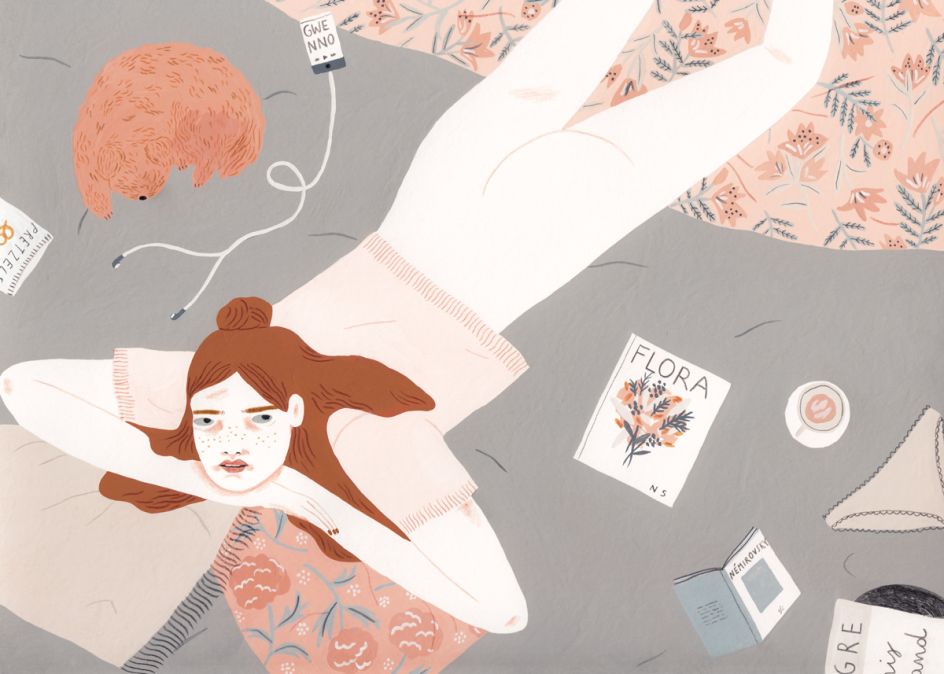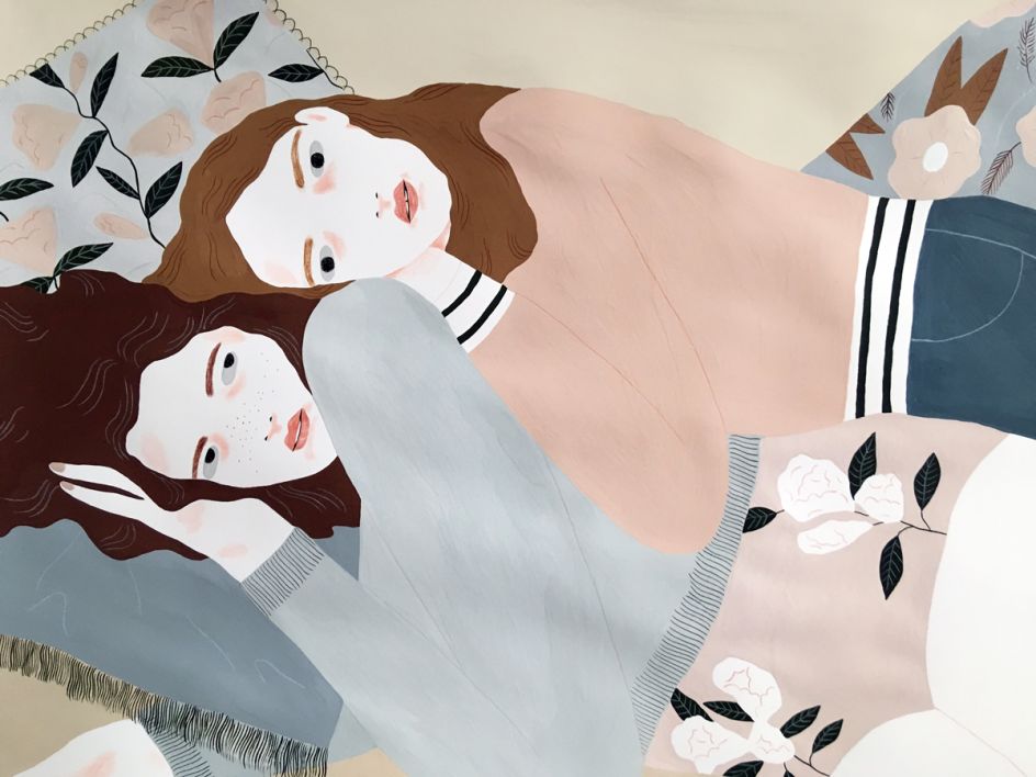 The characters I draw are mainly sourced from my imagination and my idea of beauty or what I find interesting in a face or a pose. I often take pictures of myself if I have to illustrate a pose that I find hard to draw from memory, and I don’t work much from sketches unless it’s for a client. I always paint using gouache, and I add details in coloured pencil.