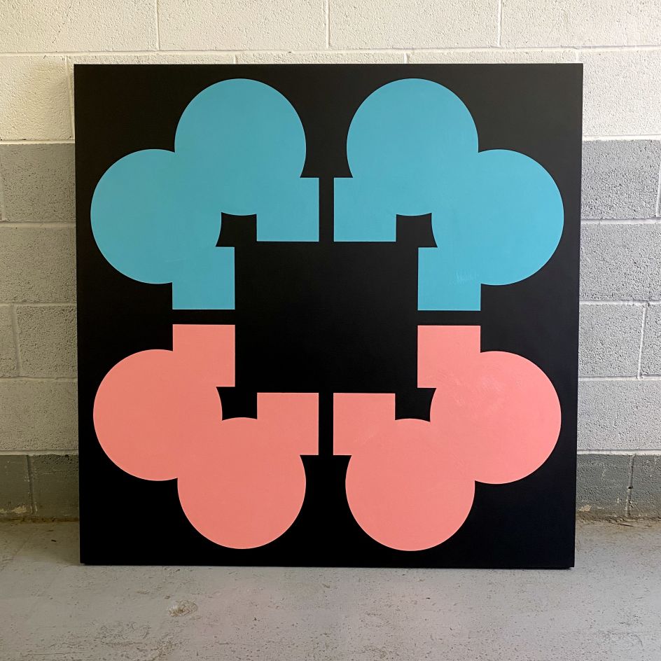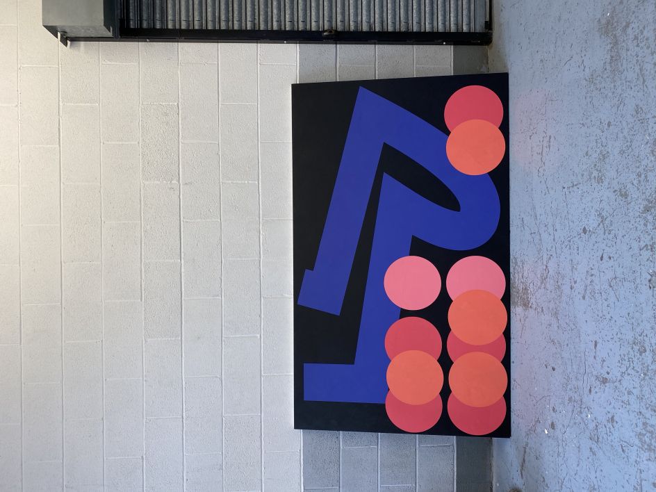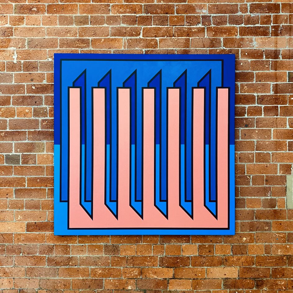 Alex's pieces tend to eschew a pure reliance on the bright primary hue, often preferring instead, subtly muted tertiary colours, sometimes overlayered in an ambiguous comment on the illusion of depth. Either way, you might need to see these paintings in real life to get the full effect.