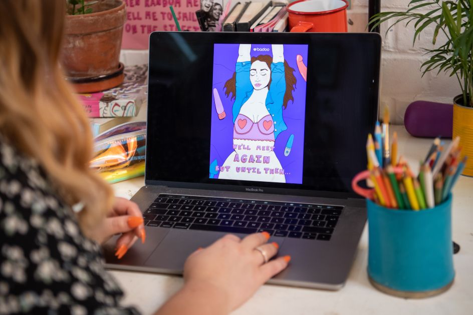 The bright collection of artworks encourages masturbation and solo sex with slogans such as 'Keep Calm and Carry On Wanking' and 'Make Do and Masturbate' – slogans that her client came up with and asked her to bring to life. It's a kind of call to "keep the home fires burning", so to speak, until it's safe to meet and get intimate with others again.