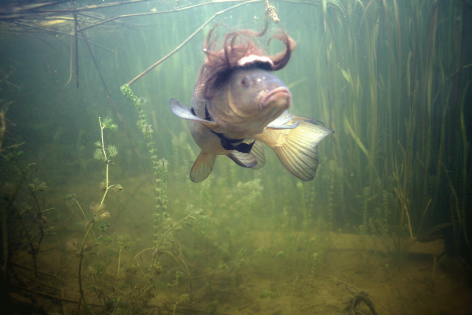 For that discovery, we’ve got artist Andrew Munks to thank: over the past couple of years he’s built his practice around painstakingly popping little hats and wigs onto fish and photographing them with lightning speed before his subjects shake off their little accoutrements into the water.