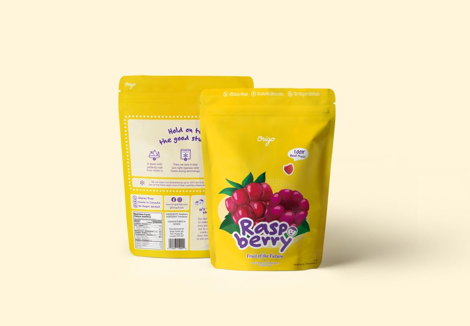 Now he's created the identity and packaging for Origo Foods, a new business venture from a young husband and wife team that sells freeze-dried fruits to parents and children, made with 100% real ingredients and zero additives.