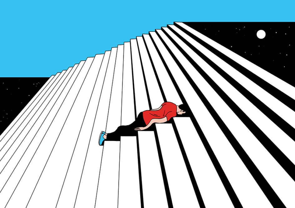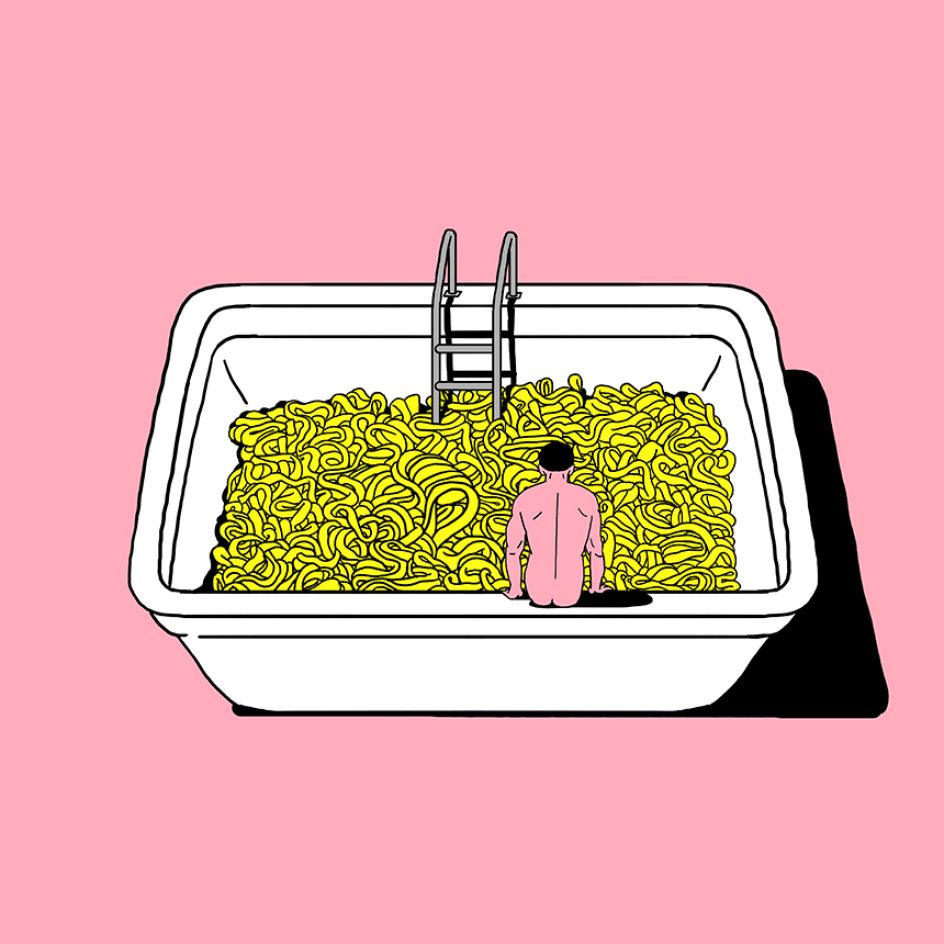 We especially love the naked man sitting on the edge of a food tray, contemplating a dive into what looks like spagetti. Or the gentleman in a red t-shirt, lying on an endless staircase that seems to reach the stars. You can see more of Andrey's mind-bending work at andreykasay.com.