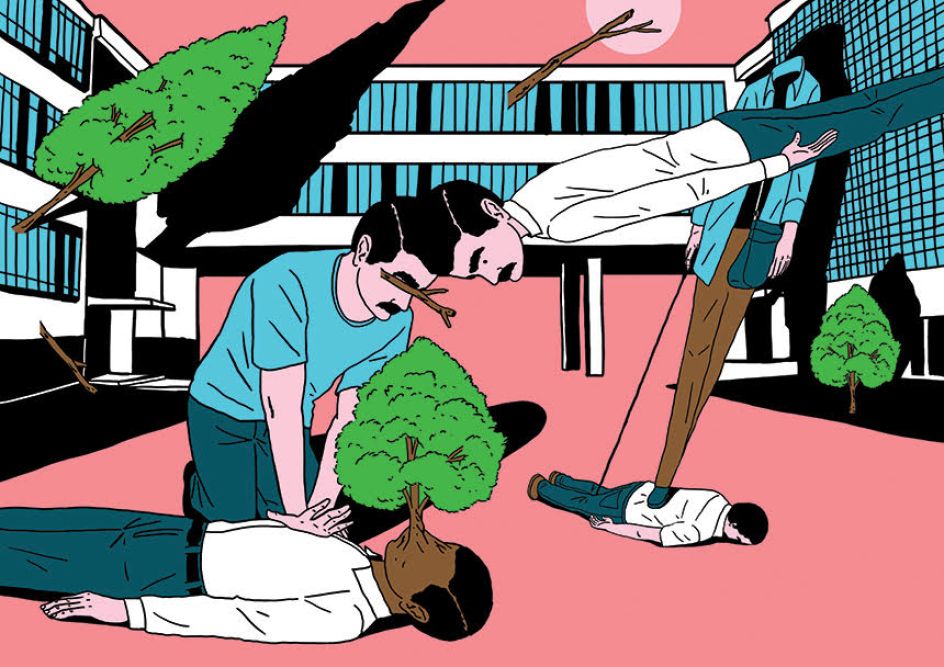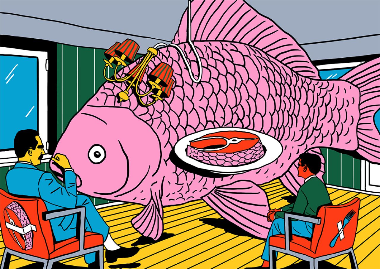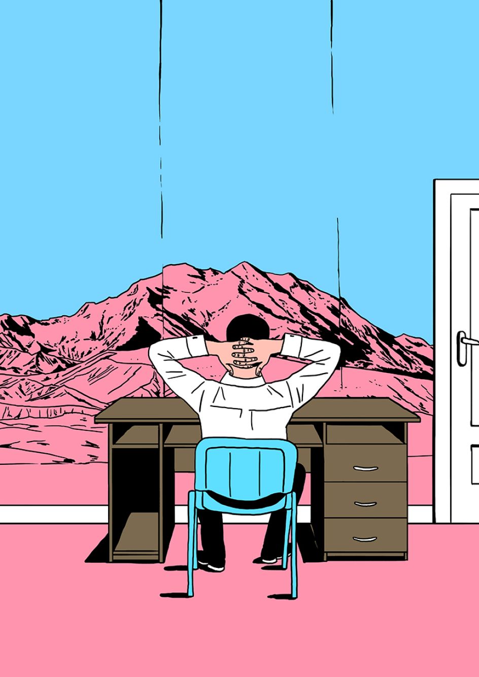 Andrey's imagined characters might be looking out to sea, for instance, only their shadow changes your perception entirely, revealing not a landscape but a wall. It's all wonderfully confusing and the pop-art colour palette only adds to the overall comedic effect.