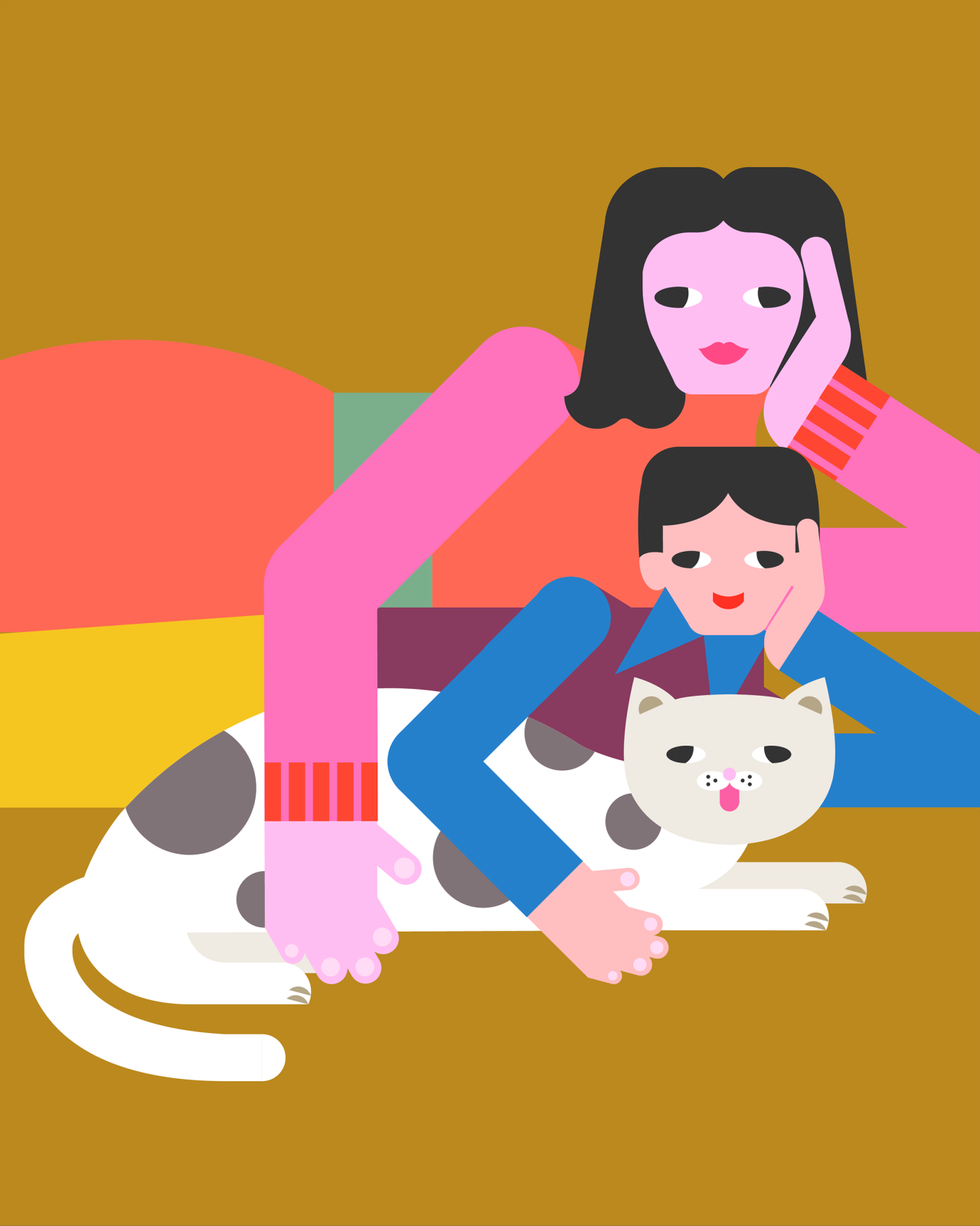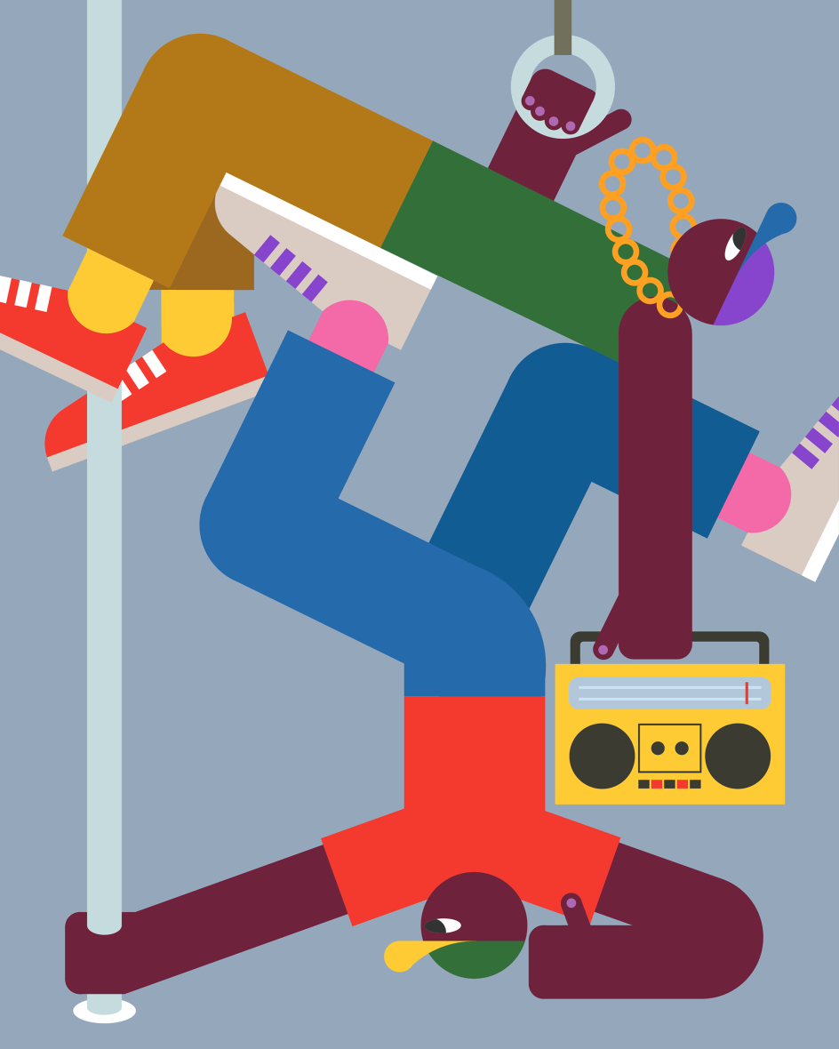 "I use flat graphics and bold colours to depict people because it resonates so well with the original and intuitive nature of our bodies. They create concise forms which everyone can relate to, and amplify their vibrancy to create an atmosphere."