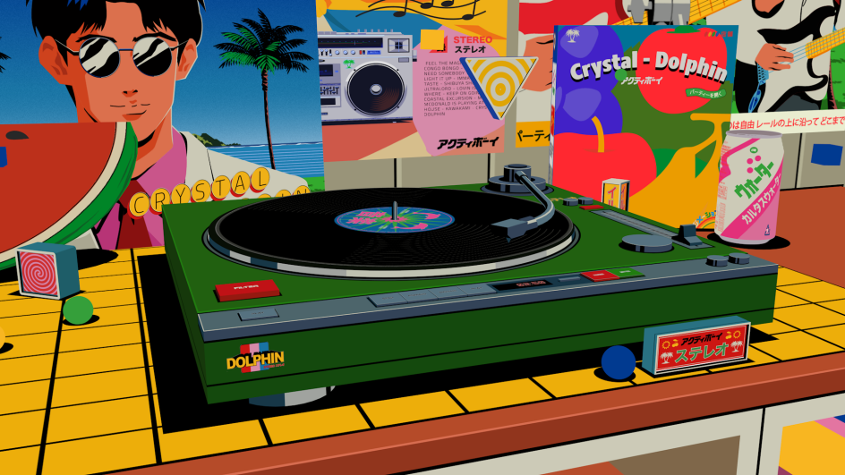 Kingo Hamada is a Japanese singer who's song Dolphin in Town is sampled in Englewood's Crystal Dolphin. Englewood is known for his sample flips and vintage stylings, so the collaboration between the producer and Ardhira seems like a match made in heaven. For Ardhira, it was about bridging the generational gap, and envisioning what old school cassette tapes, VHS players, and vinyl would look like in today's digital world. 22 seconds in and we're greeted by a retro Turbo boombox and a vinyl record floating around in the air, moving with the rhythmic flow, in a digital sphere where anything goes.