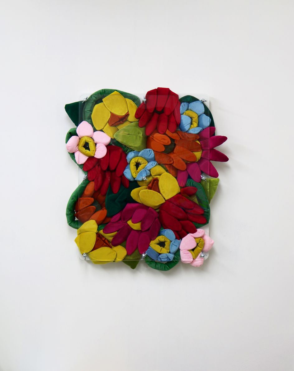 The result is an uncanny series of works where ephemeral flower petals are rendered in fabrics that will last for generations. Wedged under giant slabs of perspex in the place of a normal glass slide, these sculptures turn something familiar into something odd, all while looking natural thanks to meticulous composition.