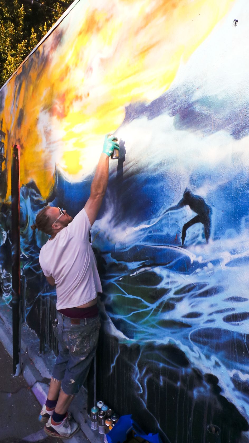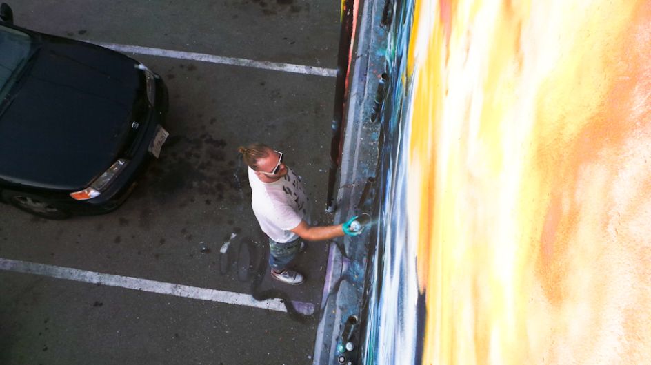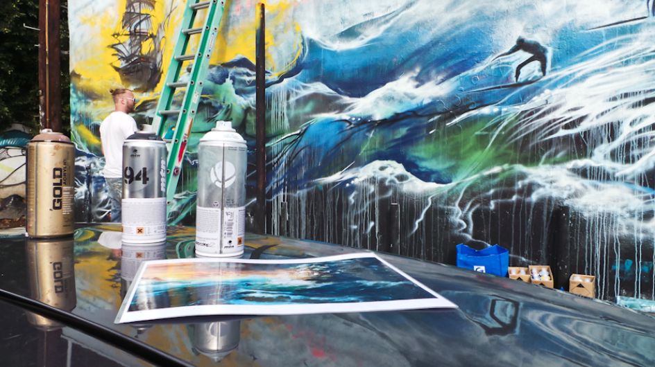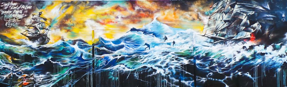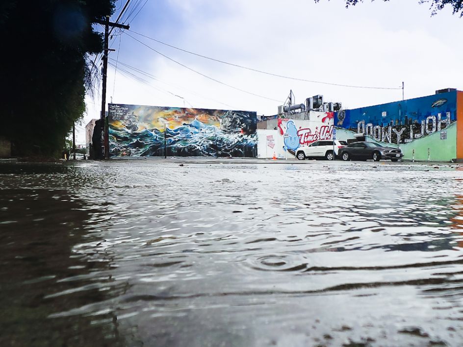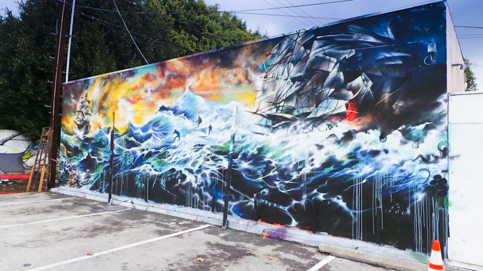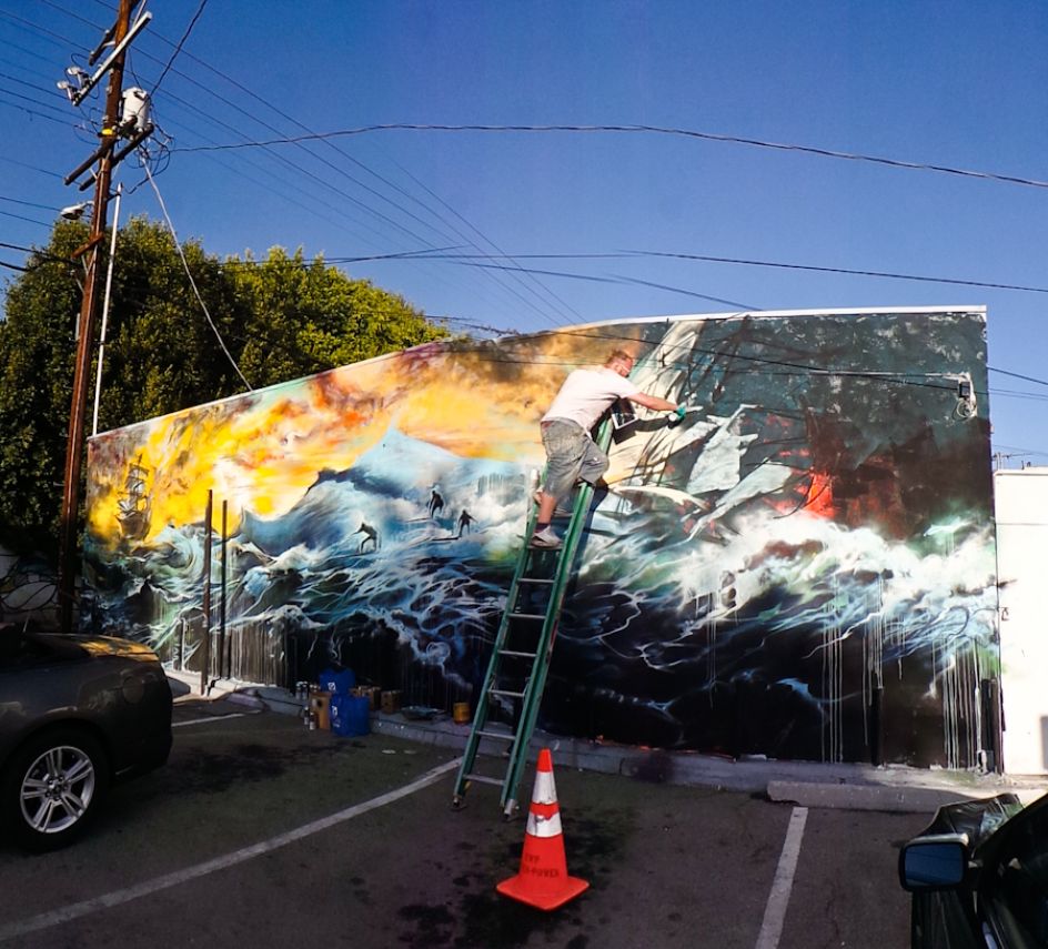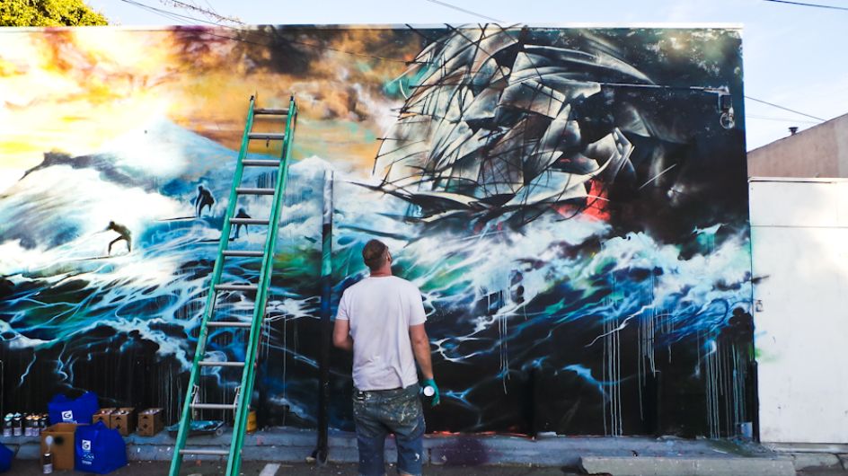 London street artist Jim Vision recently headed over to LA's Melrose district to hook up with renowned skate shop Brooklyn Project and create a new piece for their back wall. But it was something that unfortunately took on reality with the recent flood warnings and torrential rain, as the artwork featured ships and surfers battling the waves amidst an apocalyptic storm.