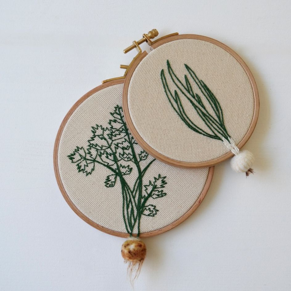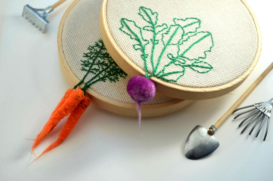 Veselka Bulkan is the person behind Little Herb Bouquet – an online shop where she sells her extraordinary, hand embroidered hoop art – mainly of clever little crafted vegetables, dangling off the edge of each canvas.