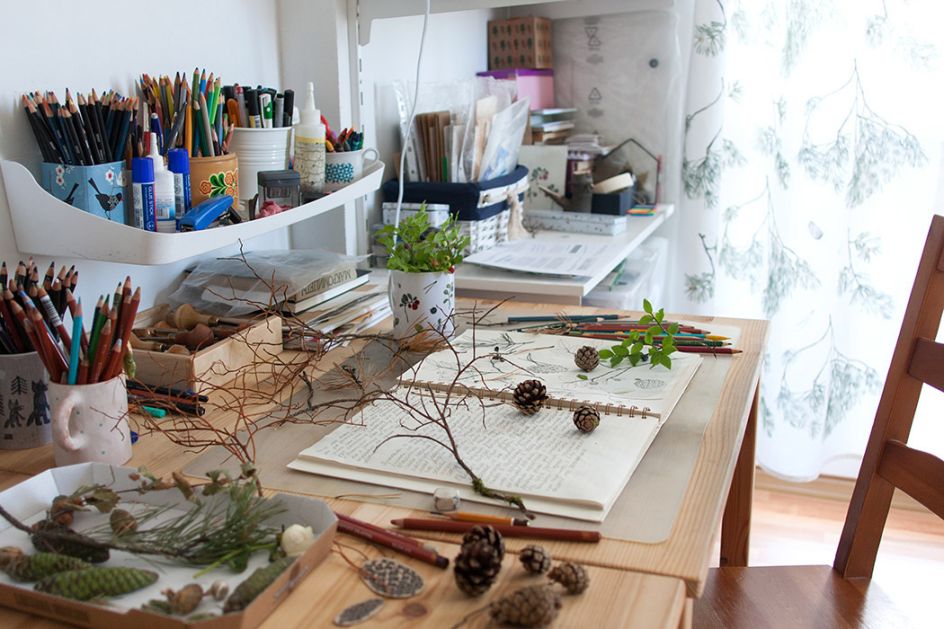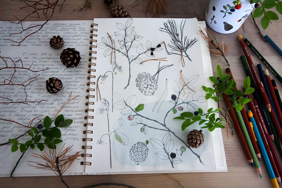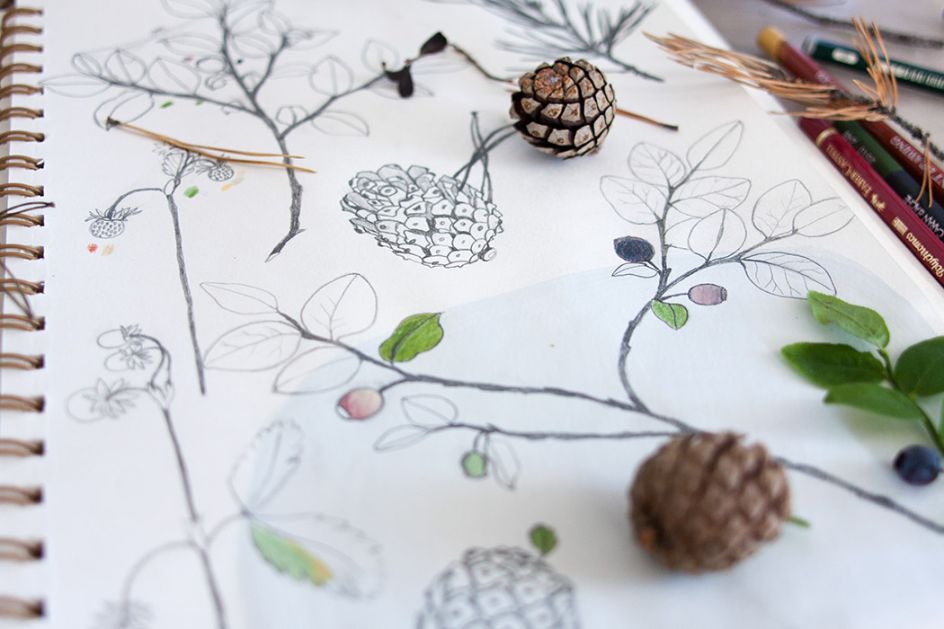 She explains: "I have a favourite spot in the forest not far away from my home — it's a bluebery meadow. There are blueberry sprigs, which have green and red leaves; there are countless cobwebs and many dried branch and yellowed pine needles. I can also find wild strawberries and of course so many pine cones.