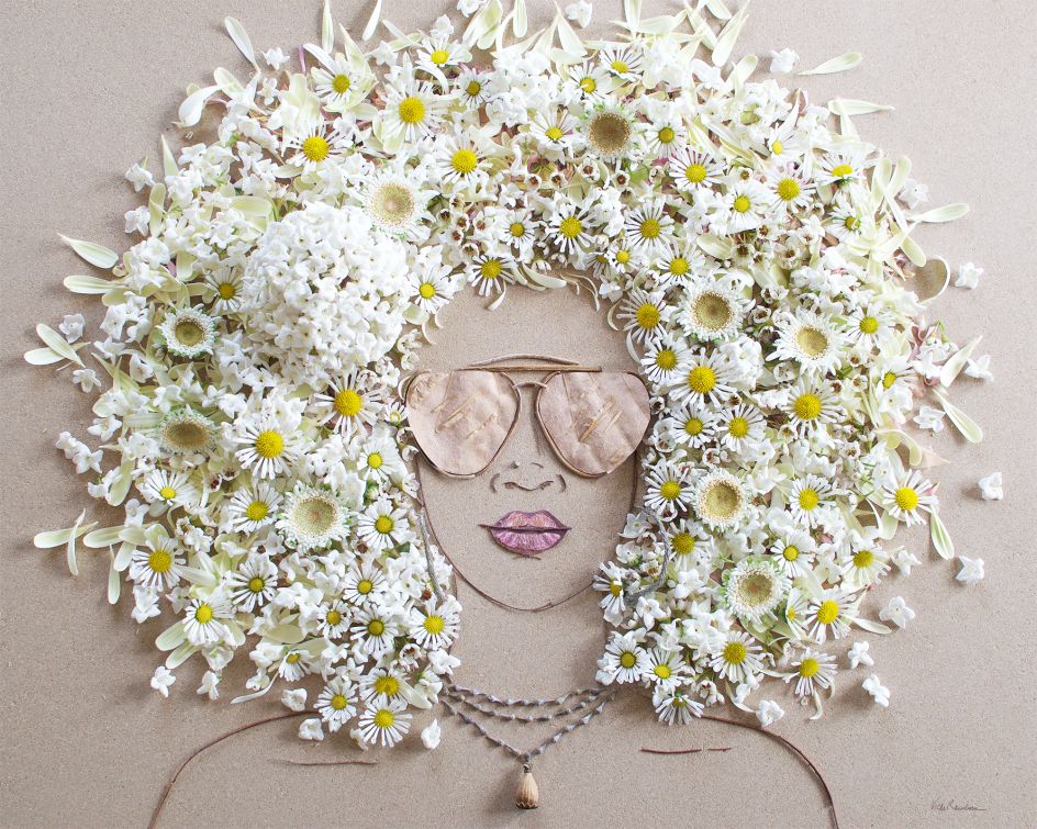 "Once back in my studio, the twigs go down to form the face. Sifting through fresh rose petals, I’m in search of the perfect pair of lips. Next, being very careful not to sneeze, I use my tweezers to place the white petal of a German Statice as the finishing highlight in the eye. There’s a freedom in knowing everything I’m doing is temporary."