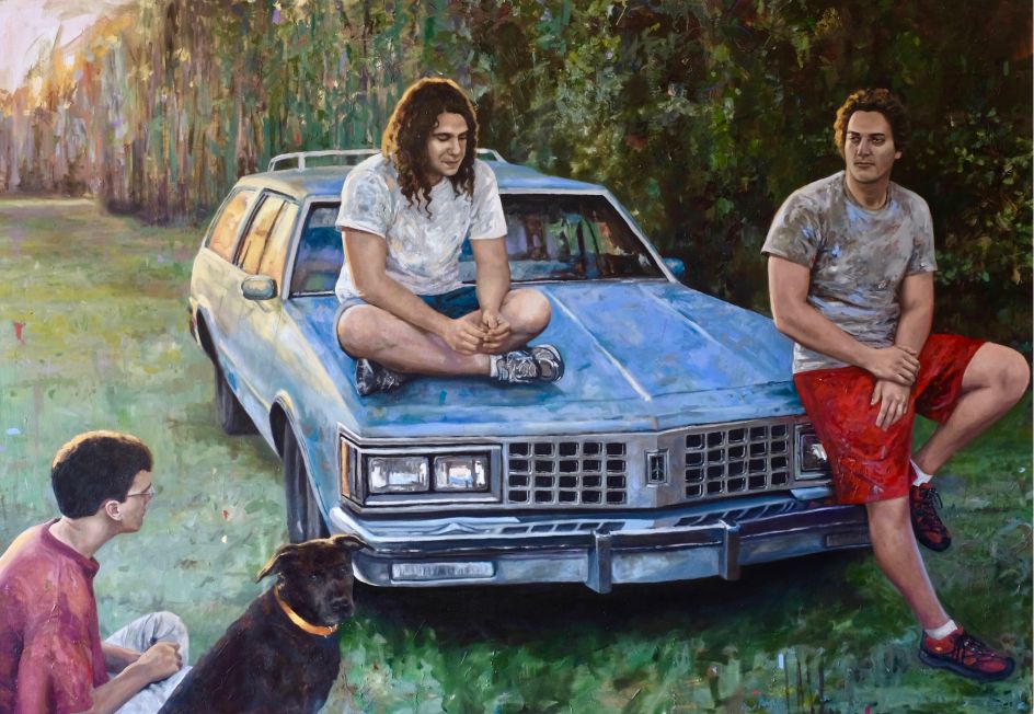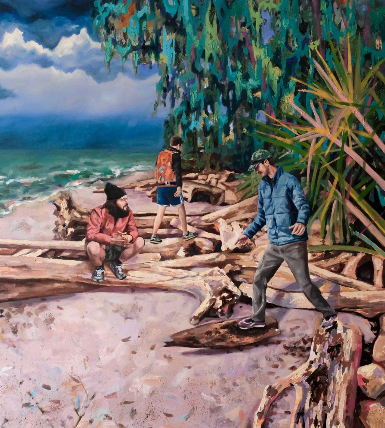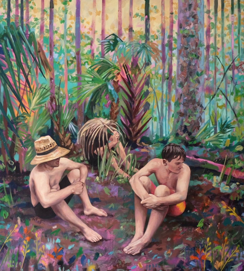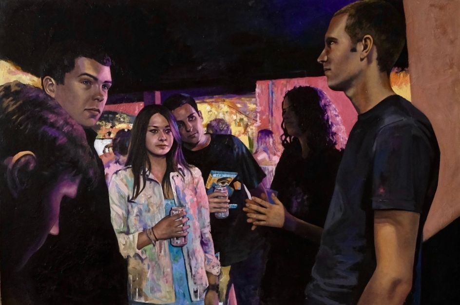 "In my compositions, I highlight the often-disconnected relationship between the individual and the groups they belong to. I employ a cool, colourful, and unnatural palette to highlight disconnection and lack of intimacy. I take liberty in creating the environments for my figures, sometimes completely removing them, sometimes abstracting them, and sometimes adding surreal elements. The paintings are not specifically narrative, but they include pictorial clues to the experience of the subjects."