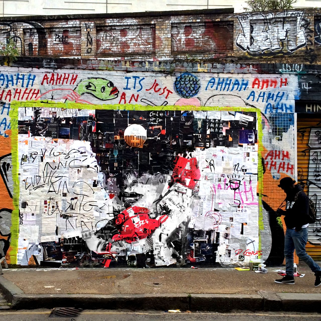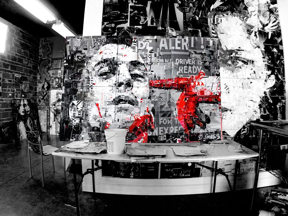After kicking off his art career creating t-shirt designs for Grateful Dead, Van Halen and Lenny Kravitz, New York native, Derek Gores moved into alternative media. Recycling magazines, maps, data, and other found materials, he creates lush collage portraits on canvas that reveal themselves the further you stand away from them.