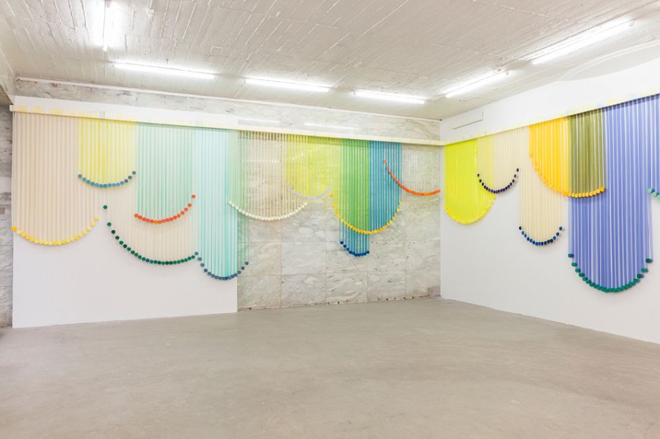Delicately hung against satisfyingly white-washed and marble walls, the various semi-transparent panels are made from a mixture of soft materials, including plastic, latex and polyurethane foam. There is plenty at play in her unusual artworks: some of the hanging pieces seem to overlap one another, often mixing two different colours to create a new shade or hue. There's also a focus on shapes – circles playing a dominant part at the tips of each hanging piece, but also in the structure of each panel itself.