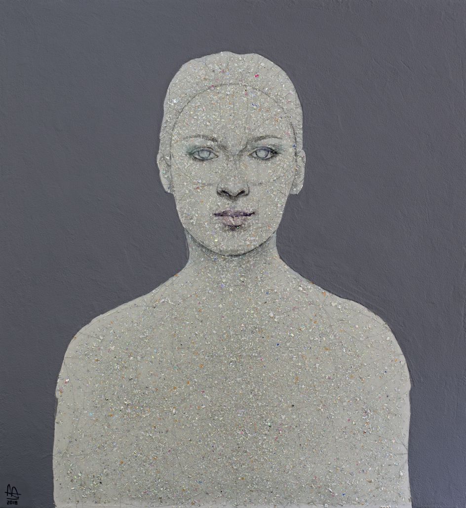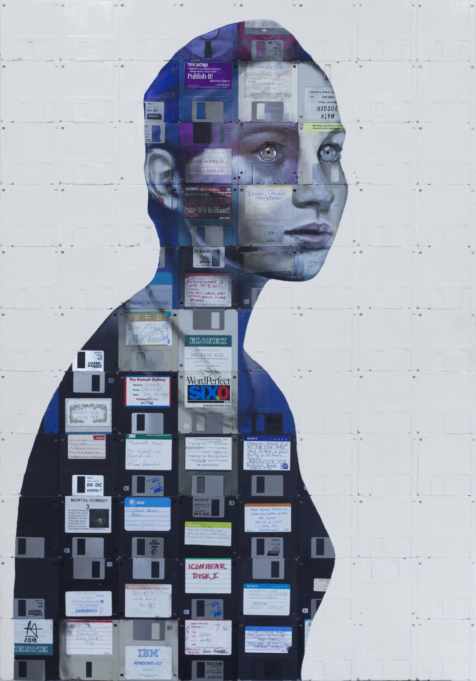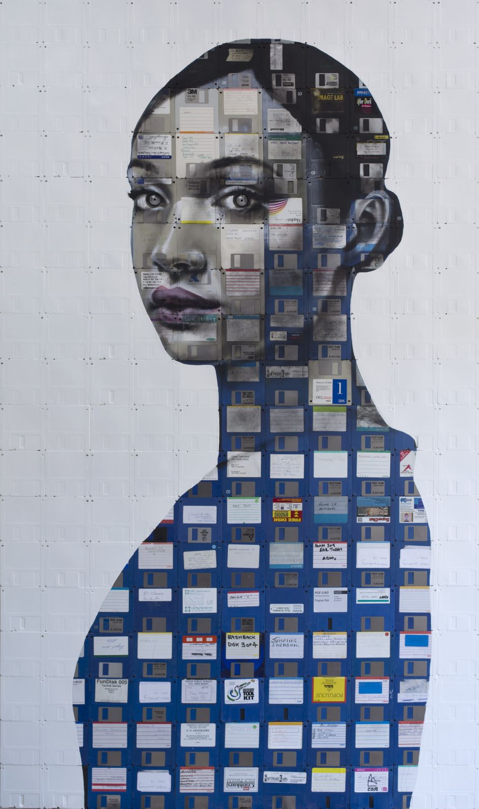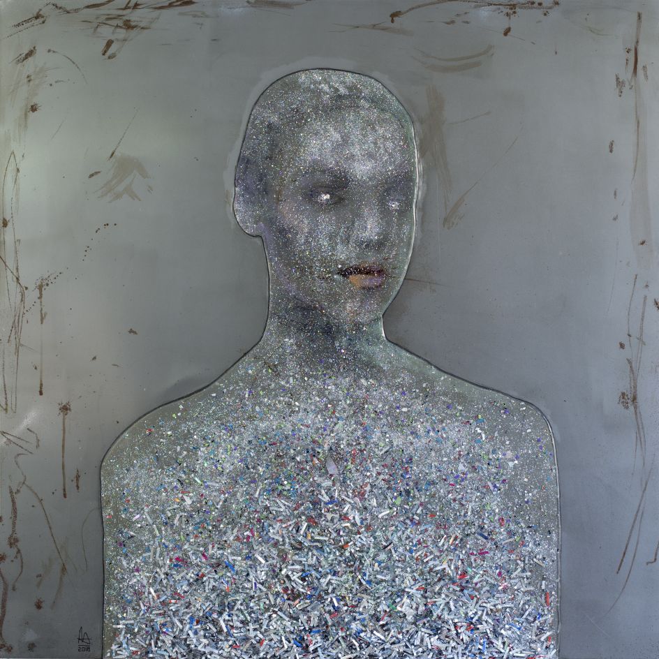 In Human Connection, an exhibition at the Opera Gallery later this month, you can see Nick's portraits of women painted onto floppy disks and fragmented CDs. The once iconic and recognisable forms (CDs) are shattered into thousands of tiny fragments. The resin glues the segments together and suspends these pieces in a holographic freeze-frame of time.