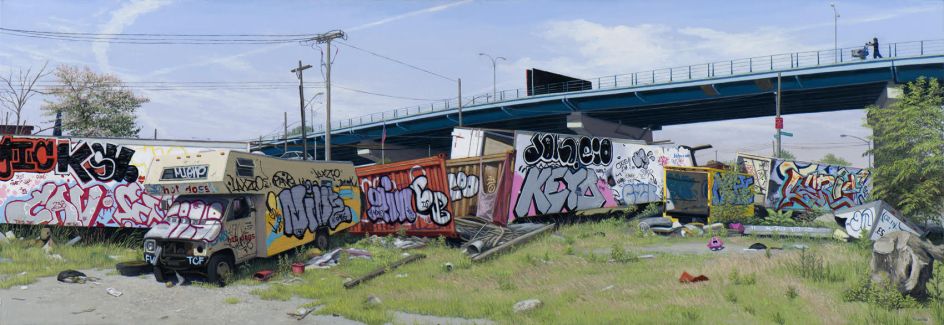 These particular artworks serve as a record of the vibrant graffiti displayed on structures throughout the borough, and on the verge of extinction. Other paintings showcase glimpses of the salt marshes and creeks that have managed to thrive within the urban sprawl. Valeri's paintings remind viewers of a Bronx that coexists as both a city and nature reserve, capable of gritty and touching beauty, while also focusing on themes of memory, preservation, and expansion.