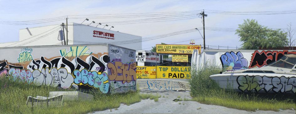 For over thirty years, Valeri Larko has drawn inspiration for her paintings from the dilapidated industrial landscapes of New Jersey and New York. She focuses on the collision between nature and man-made infrastructures evident in forgotten side streets, waterways, derelict factories, and salvage yards, revealing stories that exist at the fringes of city life.