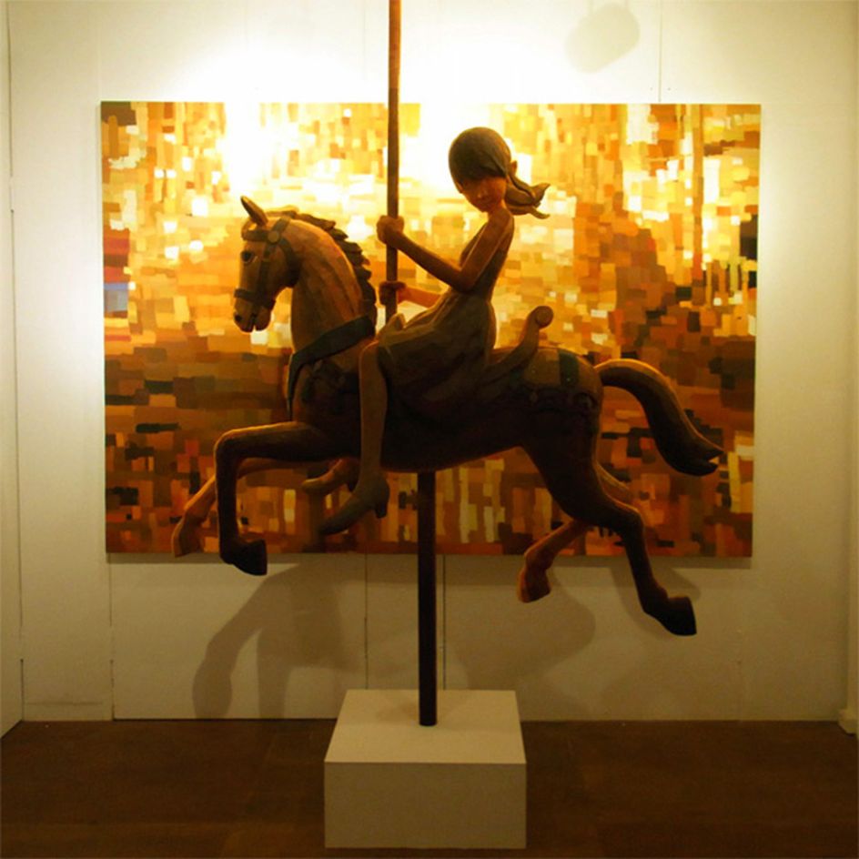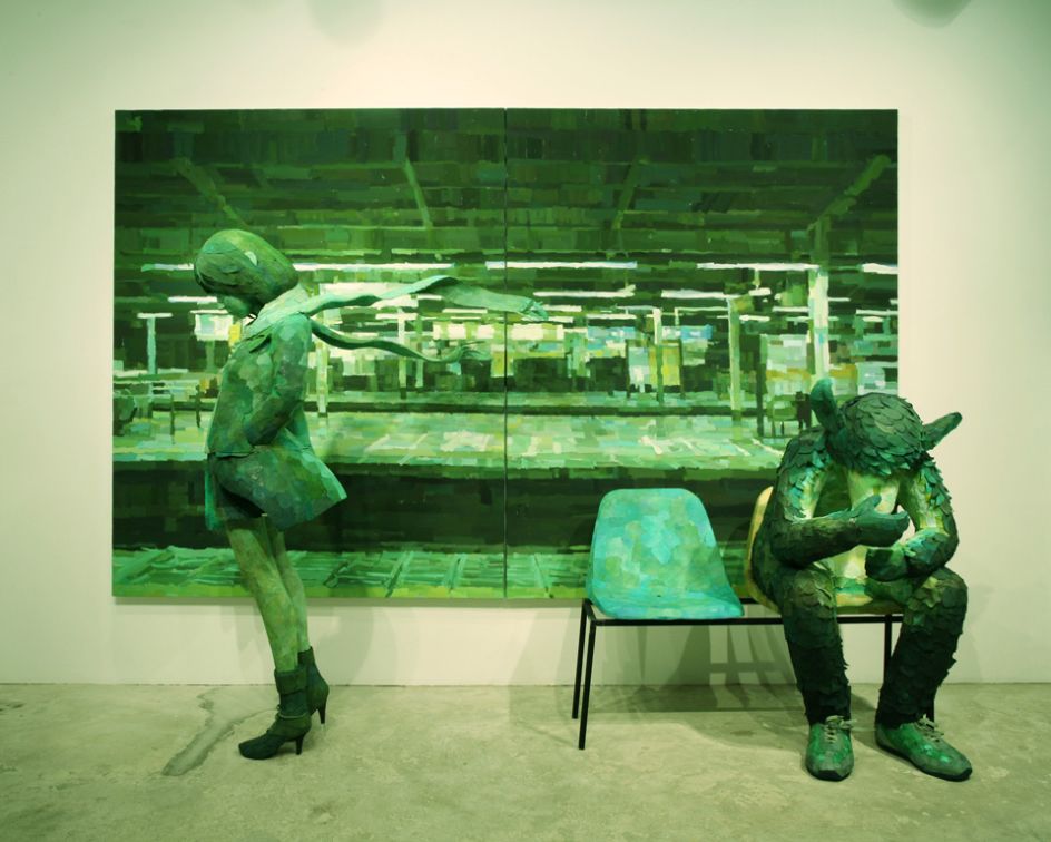 Sculpted from polystyrene which are then painted to perfectly match their traditional 2D acrylic backgrounds, Ohata’s characteristic blend of 2D and 3D dimensions came about after he wondered: “I could bring the atmosphere or dynamism of my paintings with a more different way if I place sculptures in front of paintings.”