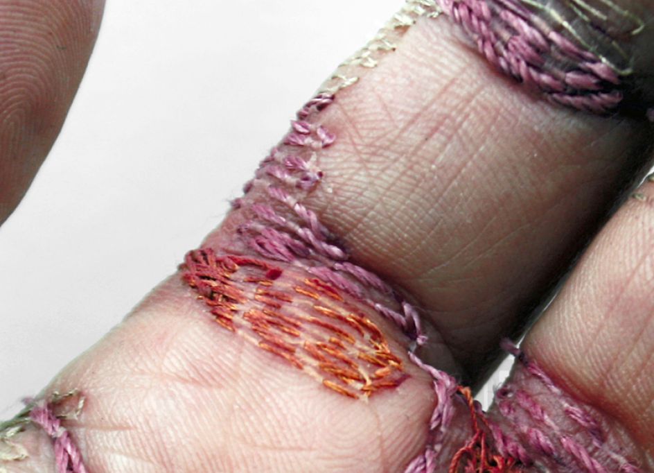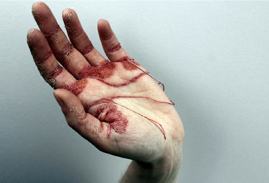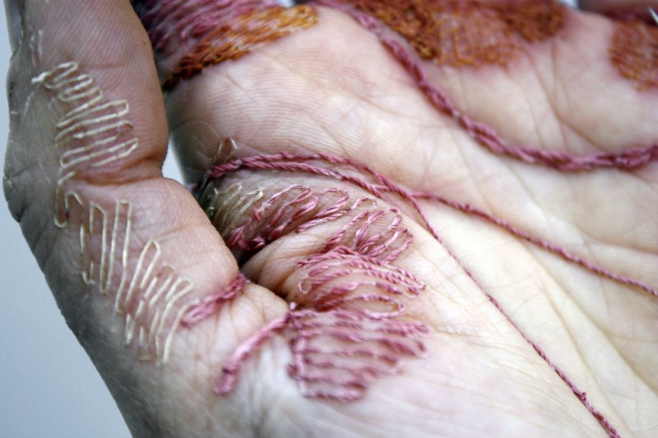 London-based artist Eliza Bennett uses her own hand as a canvas, stitching thread into the top layer of her skin to create unusual embroidered artworks, as part of a series entitled 'A Woman's Work is Never Done' to give the impression of hard work.