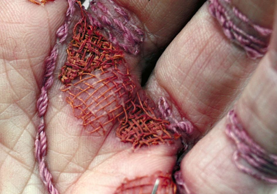 The technique is something she recalls first applying to her hand under a table during a home economics class in school: "I was totally amazed to find that I could pass a needle under the top layers of skin without any pain, only a mild discomfort. As with many childhood whims it passed and I hadn't thought any more about it, until quite recently when I decided to apply the process to my hand to make it appear calloused and work-worn like that of a manual labourer.