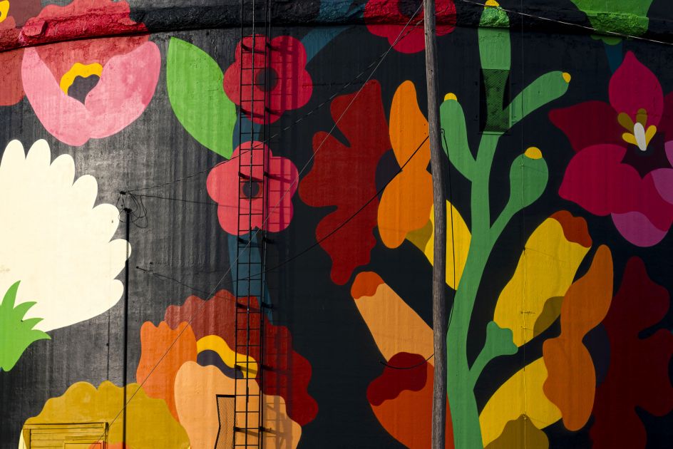 Called Magical Unity, the mural is like a giant circular flower bed and was painstakingly hand-painted by the duo in just a week. Says Justkids curator Charlotte Dutoit of the project: "DabsMyla's mastery of colour theory and composition dynamic perfectly speaks to the cylindrical nature of the canvas. The piece creates an unexpected dialogue with the surrounding nature and invites the viewer to step into their mesmerising peaceful world."