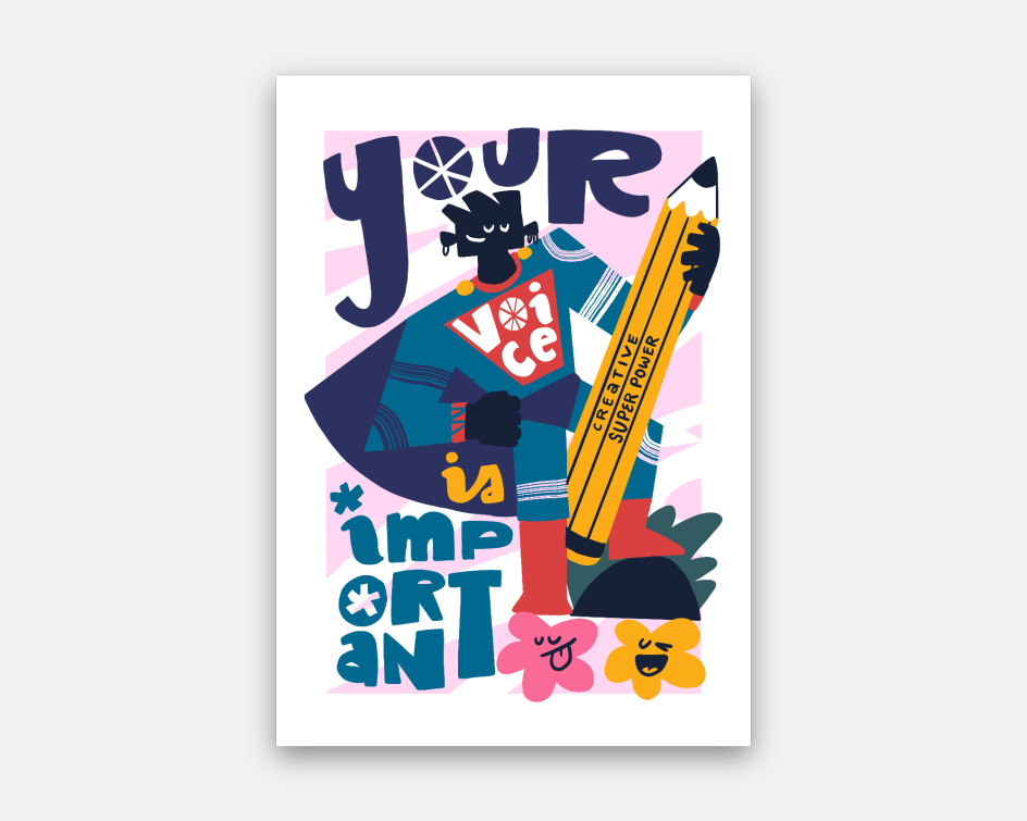 Ashwin Chacko's joyful work is full of bold lines and shapes with characters intermingled with hand-lettered positive messages and vibrant patterns, often tackling serious topics in a lighthearted, humorous way.