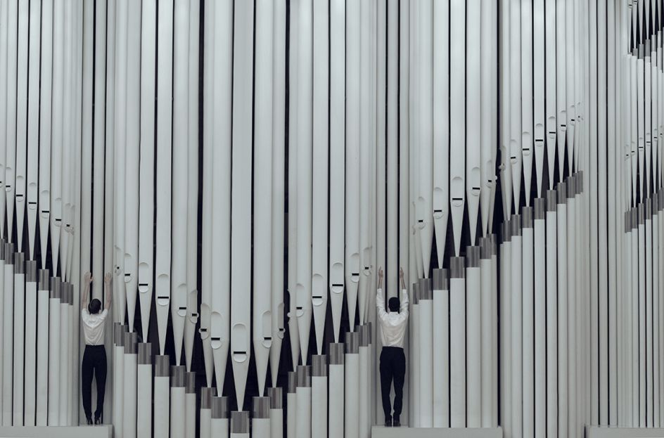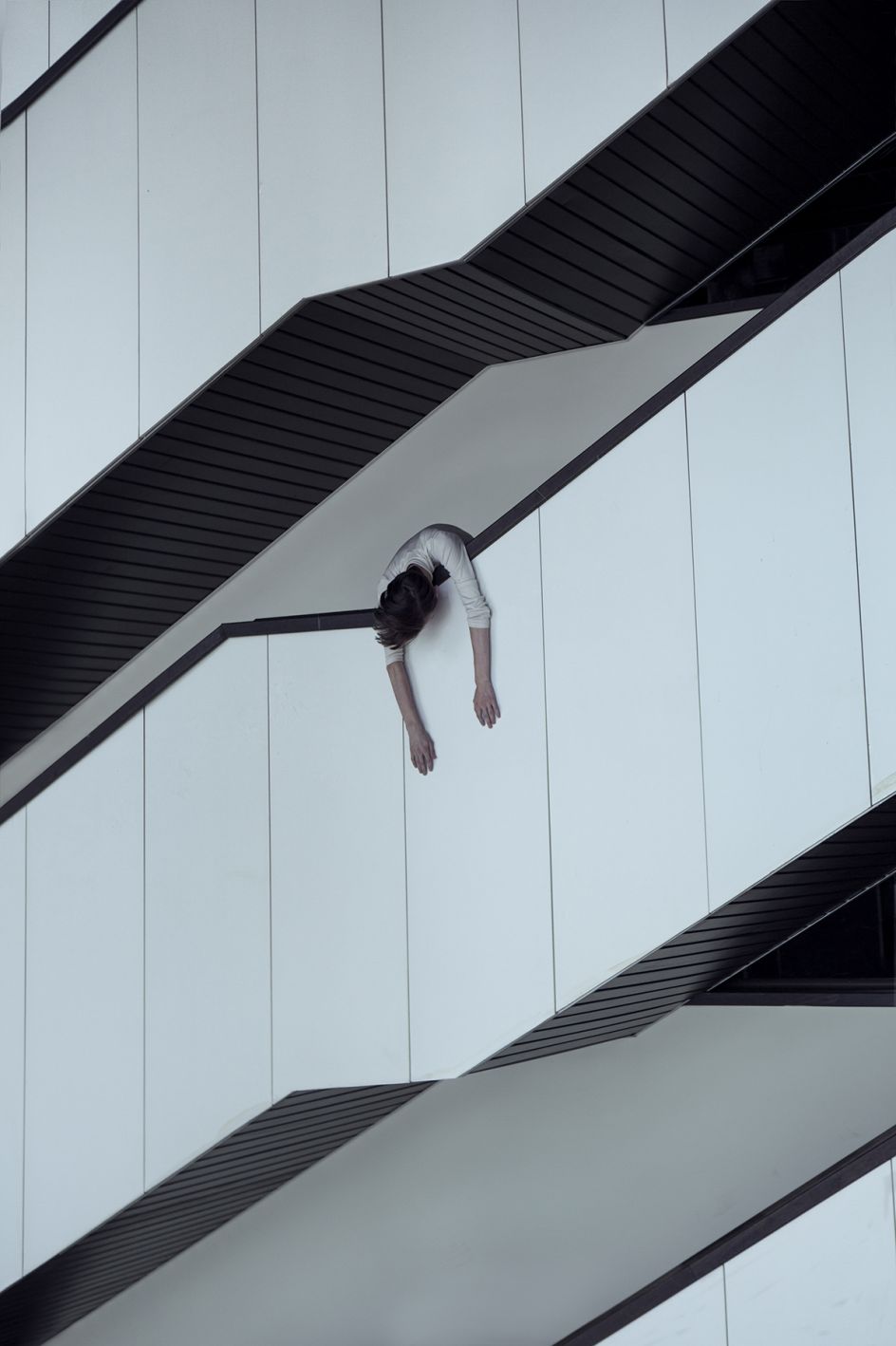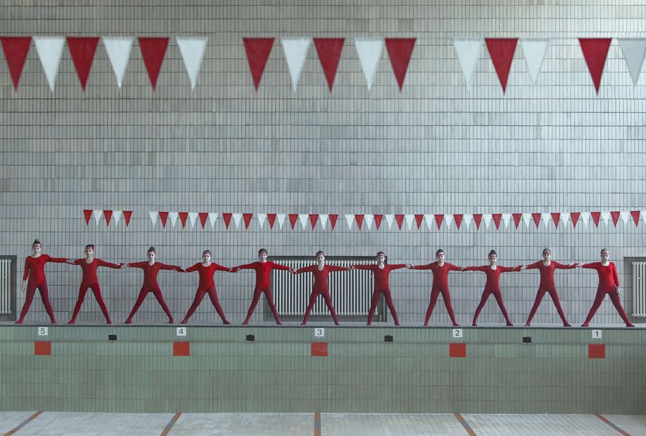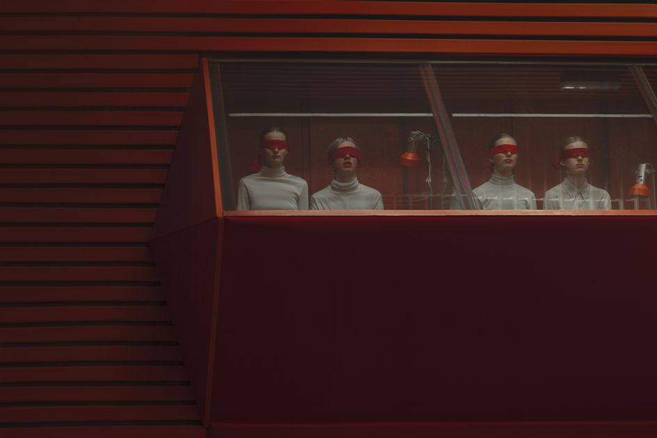 The featured models in the series pose in coherent geometrical compositions, a symbol of the regime itself. "People create a pattern," says Evelyn. They become part of the overall composition: architecture and society. Each person is stripped of their own individuality to become a unified form, creating an absurd platform where every difference is an anomaly."