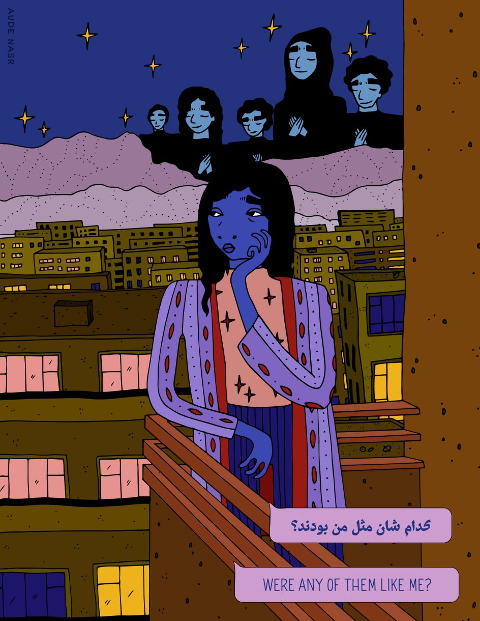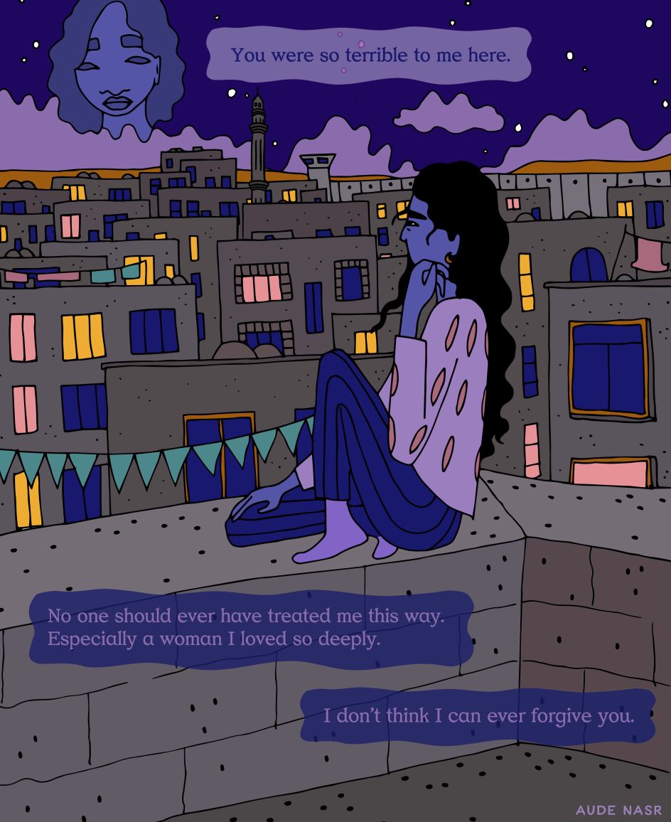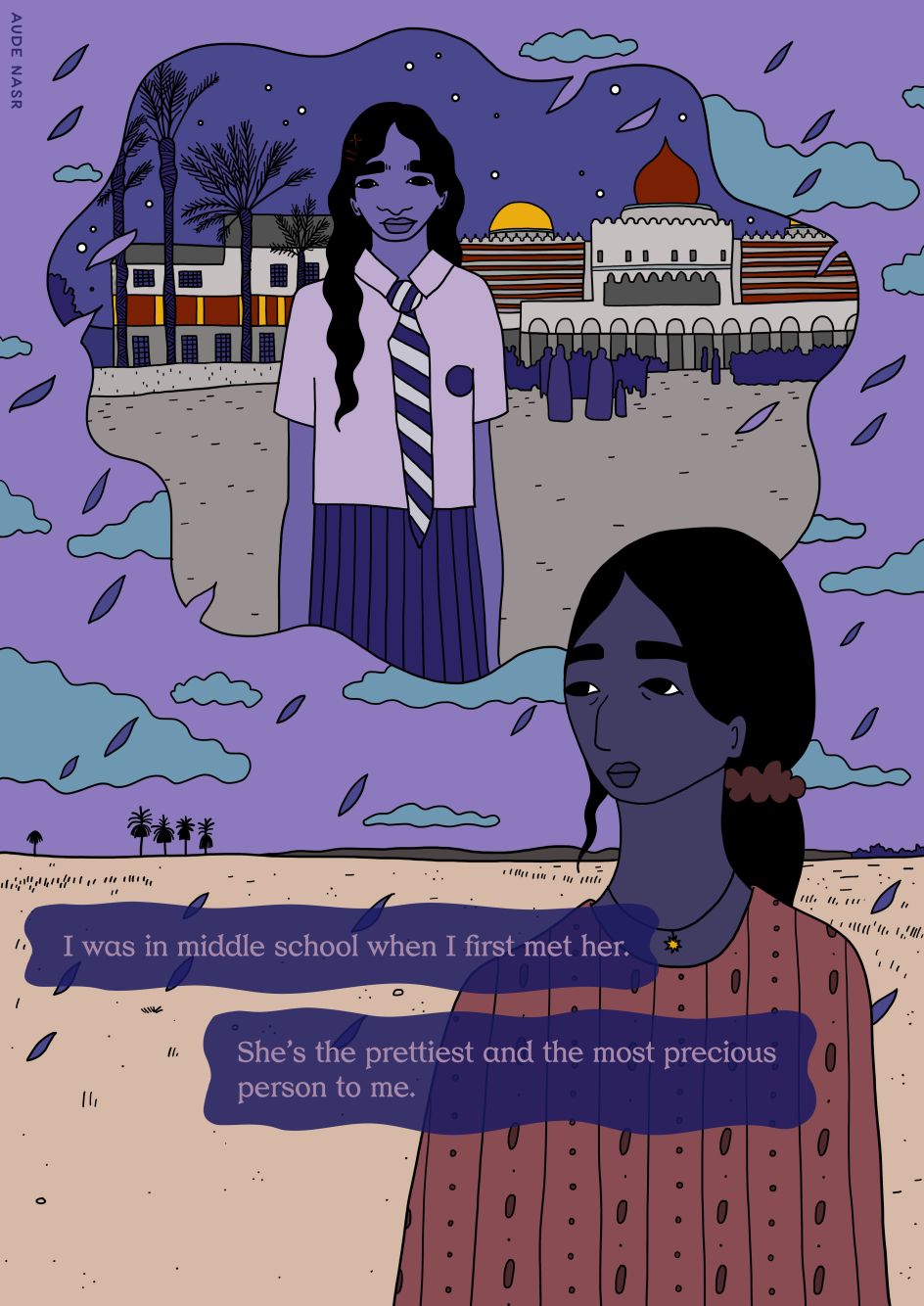 Illustrator Aude Nasr first became aware of Queering The Map in 2018, which she says was a time when there were less resources for queer individuals to share and read their experiences. For this reason, the project spoke to her, and a couple of years later, one of Aude's followers asked her to draw a pin based on their experiences as a lesbian.